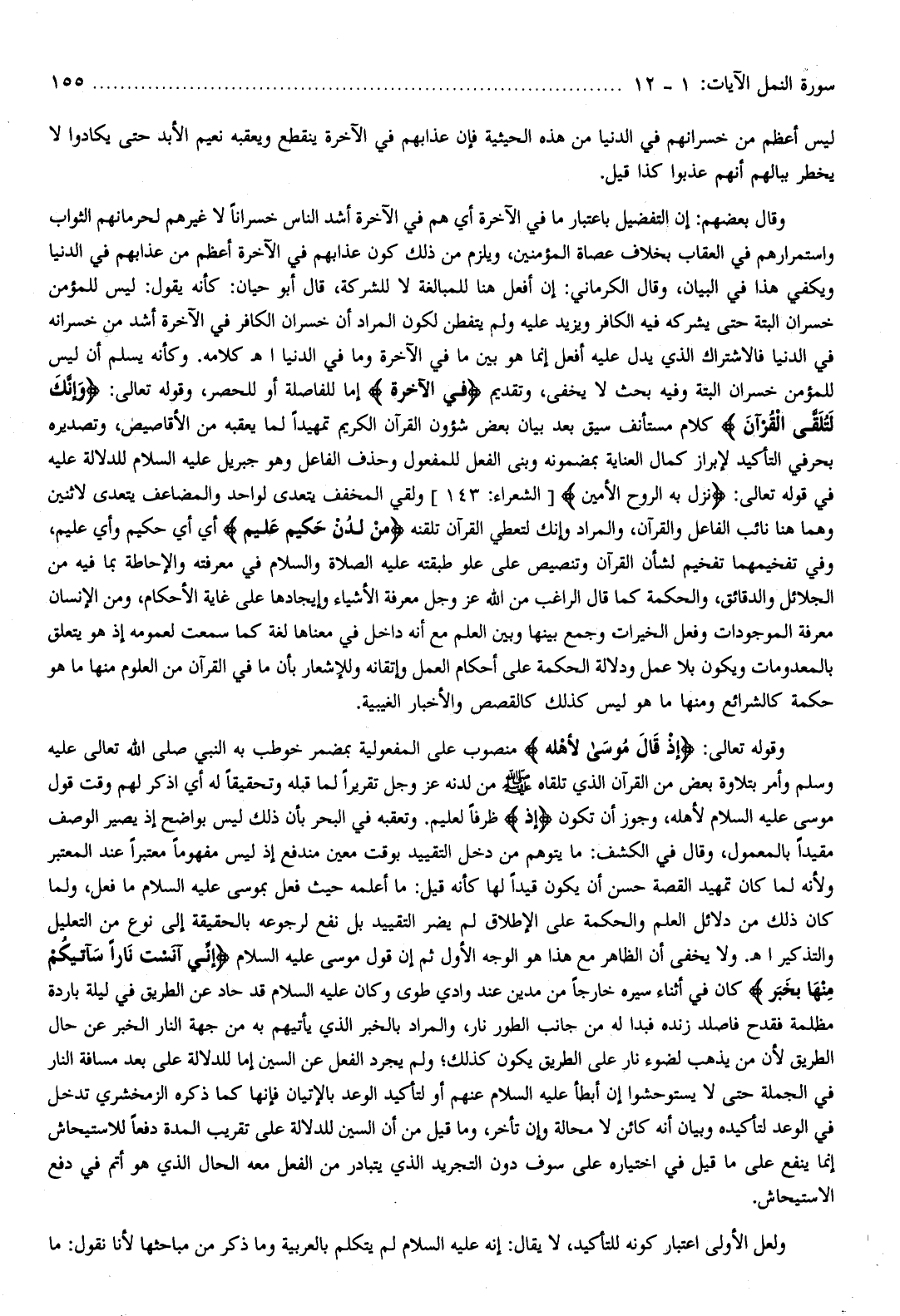 وقوله تعالى: إِذْ قالَ مُوسى لِأَهْلِهِ منصوب على المفعولية بمضمر خوطب به النبي صلّى الله تعالى عليه وسلّم وأمر بتلاوة بعض من القرآن الذي تلقاه صلّى الله عليه وسلّم من لدنه عز وجل تقريرا لما قبله وتحقيقا له أي اذكر لهم وقت قول موسى عليه السلام لأهله، وجوز أن تكون إِذْ ظرفا لعليم. وتعقبه في البحر بأن ذلك ليس بواضح إذ يصير الوصف مقيدا بالمعمول، وقال في الكشف: ما يتوهم من دخل التقييد بوقت معين مندفع إذ ليس مفهوما معتبرا عند المعتبر ولأنه لما كان تمهيد القصة حسن أن يكون قيدا لها كأنه قيل: ما أعلمه حيث فعل بموسى عليه السلام ما فعل، ولما كان ذلك من دلائل العلم والحكمة على الإطلاق لم يضر التقييد بل نفع لرجوعه بالحقيقة إلى نوع من التعليل والتذكير اهـ. ولا يخفى أن الظاهر مع هذا هو الوجه الأول ثم إن قول موسى عليه السلام إِنِّي آنَسْتُ ناراً سَآتِيكُمْ مِنْها بِخَبَرٍ كان في أثناء سيره خارجا من مدين عند وادي طوى وكان عليه السلام قد حاد عن الطريق في ليلة باردة مظلمة فقدح فاصلد زنده فبدا له من جانب الطور نار، والمراد بالخبر الذي يأتيهم به من جهة النار الخبر عن حال الطريق لأن من يذهب لضوء نار على الطريق يكون كذلك ولم يجرد الفعل عن السين إما للدلالة على بعد مسافة النار في الجملة حتى لا يستوحشوا إن أبطأ عليه السلام عنهم أو لتأكيد الوعد بالإتيان فإنها كما ذكره الزمخشري تدخل في الوعد لتأكيده وبيان أنه كائن لا محالة وإن تأخر، وما قيل من أن السين للدلالة على تقريب المدة دفعا للاستيحاش إنما ينفع على ما قيل في اختياره على سوف دون التجريد الذي يتبادر من الفعل معه الحال الذي هو أتم في دفع الاستيحاش.