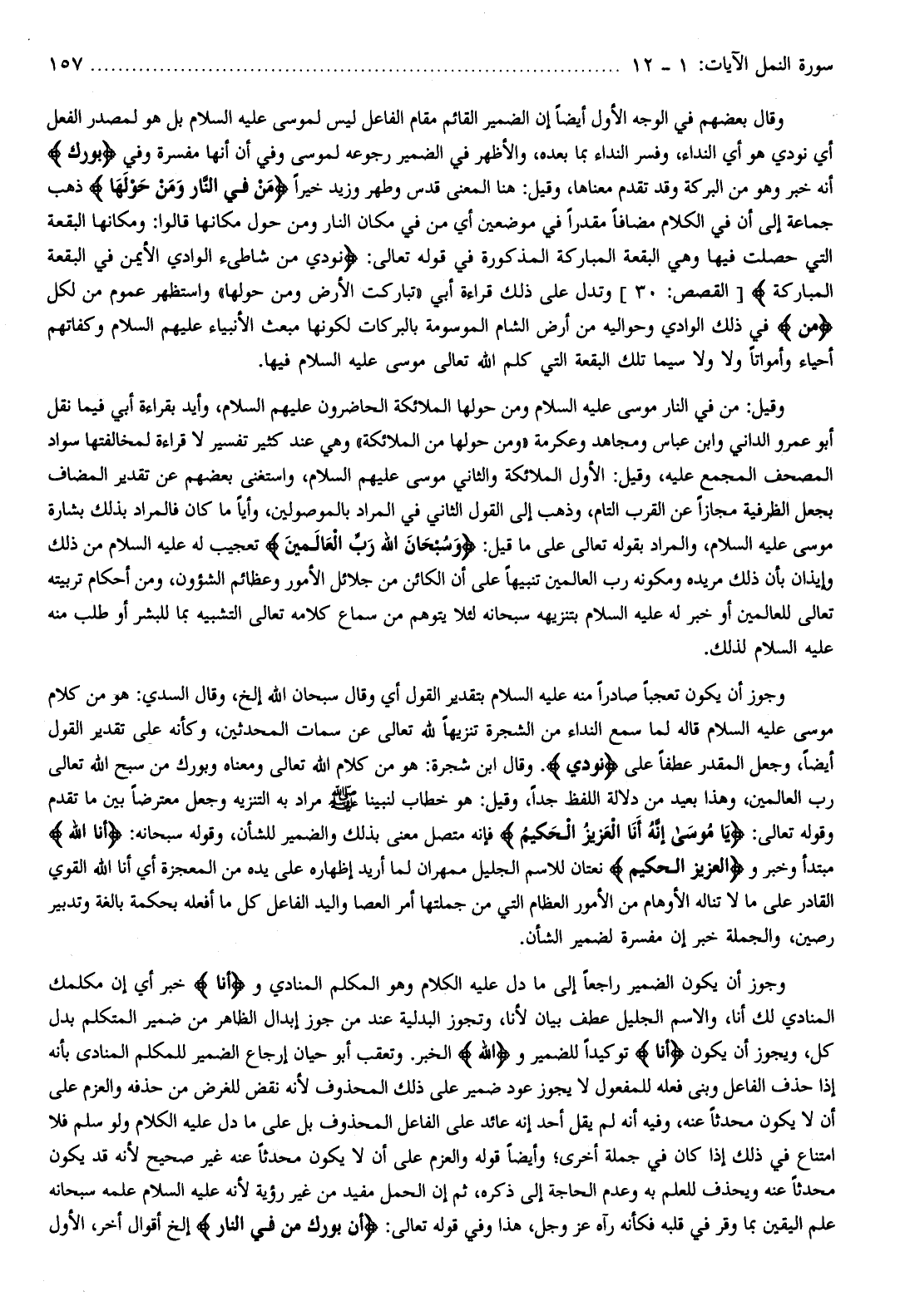 وجوز أن يكون الضمير راجعا إلى ما دل عليه الكلام وهو المكلم المنادي وأَنَا خبر أي إن مكلمك المنادي لك أنا، والاسم الجليل عطف بيان لأنا، وتجوز البدلية عند من جوز إبدال الظاهر من ضمير المتكلم بدل كل، ويجوز أن يكون أَنَا توكيدا للضمير واللَّهُ الخبر. وتعقب أبو حيان إرجاع الضمير للمكلم المنادى بأنه إذا حذف الفاعل وبنى فعله للمفعول لا يجوز عود ضمير على ذلك المحذوف لأنه نقض للغرض من حذفه والعزم على أن لا يكون محدثا عنه، وفيه أنه لم يقل أحد إنه عائد على الفاعل المحذوف بل على ما دل عليه الكلام ولو سلّم فلا امتناع في ذلك إذا كان في جملة أخرى وأيضا قوله والعزم على أن لا يكون محدثا عنه غير صحيح لأنه قد يكون محدثا عنه ويحذف للعلم به وعدم الحاجة إلى ذكره، ثم إن الحمل مفيد من غير رؤية لأنه عليه السلام علمه سبحانه علم اليقين بما وقر في قلبه فكأنه رآه عز وجل، هذا وفي قوله تعالى: أَنْ بُورِكَ مَنْ فِي النَّارِ إلخ أقوال أخر، الأول