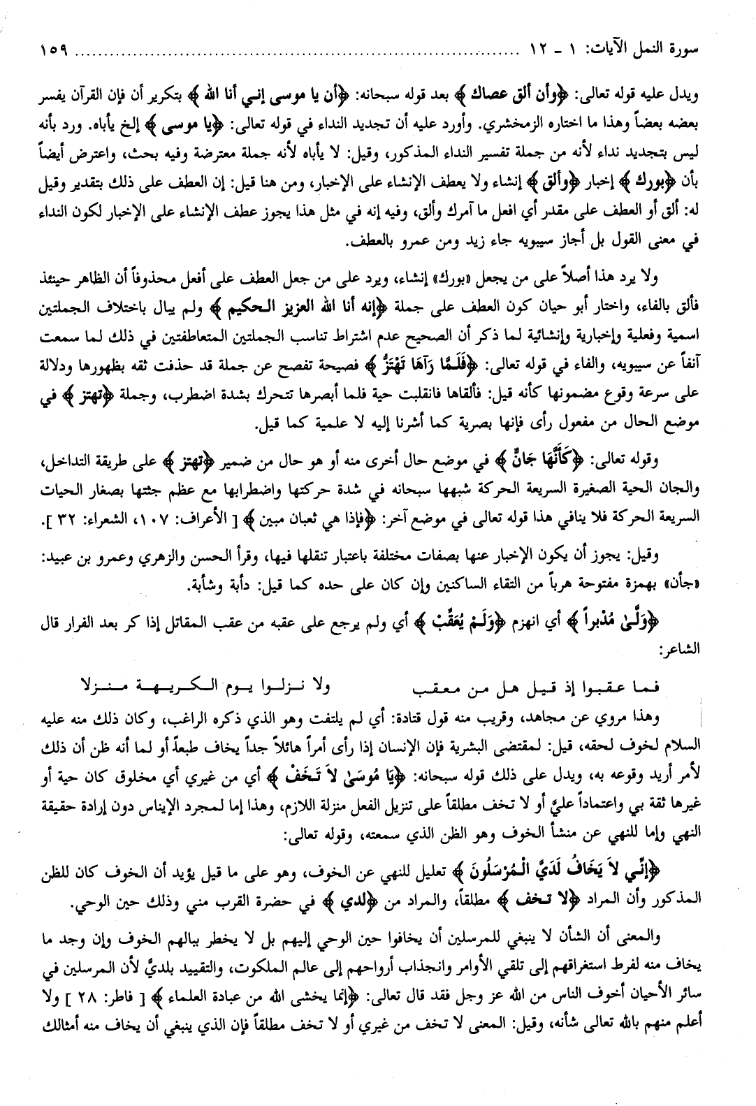 ولا يرد هذا أصلا على من يجعل «بورك» إنشاء، ويرد على من جعل العطف على أفعل محذوفا أن الظاهر حينئذ فألق بالفاء، واختار أبو حيان كون العطف على جملة إِنَّهُ أَنَا اللَّهُ الْعَزِيزُ الْحَكِيمُ ولم يبال باختلاف الجملتين اسمية وفعلية وإخبارية وإنشائية لما ذكر أن الصحيح عدم اشتراط تناسب الجملتين المتعاطفتين في ذلك لما سمعت آنفا عن سيبويه، والفاء في قوله تعالى: فَلَمَّا رَآها تَهْتَزُّ فصيحة تفصح عن جملة قد حذفت ثقه بظهورها ودلالة على سرعة وقوع مضمونها كأنه قيل: فألقاها فانقلبت حية فلما أبصرها تتحرك بشدة اضطرب، وجملة تَهْتَزُّ في موضع الحال من مفعول رأى فإنها بصرية كما أشرنا إليه لا علمية كما قيل.