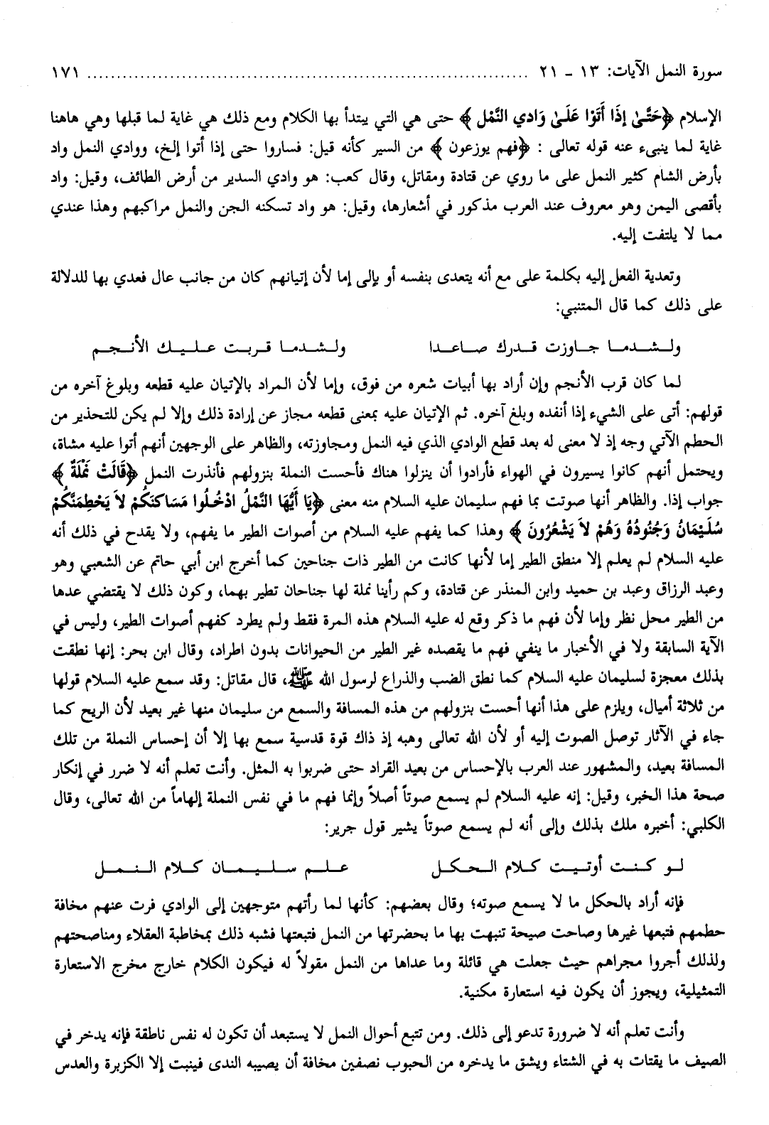 لما كان قرب الأنجم وإن أراد بها أبيات شعره من فوق، وإما لأن المراد بالإتيان عليه قطعه وبلوغ آخره من قولهم: أتى على الشيء إذا أنفده وبلغ آخره. ثم الإتيان عليه بمعنى قطعه مجاز عن إرادة ذلك وإلا لم يكن للتحذير من الحطم الآتي وجه إذ لا معنى له بعد قطع الوادي الذي فيه النمل ومجاوزته، والظاهر على الوجهين أنهم أتوا عليه مشاة، ويحتمل أنهم كانوا يسيرون في الهواء فأرادوا أن ينزلوا هناك فأحست النملة بنزولهم فأنذرت النمل قالَتْ نَمْلَةٌ جواب إذا. والظاهر أنها صوتت بما فهم سليمان عليه السلام منه معنى يا أَيُّهَا النَّمْلُ ادْخُلُوا مَساكِنَكُمْ لا يَحْطِمَنَّكُمْ سُلَيْمانُ وَجُنُودُهُ وَهُمْ لا يَشْعُرُونَ وهذا كما يفهم عليه السلام من أصوات الطير ما يفهم، ولا يقدح في ذلك أنه عليه السلام لم يعلم إلا منطق الطير إما لأنها كانت من الطير ذات جناحين كما أخرج ابن أبي حاتم عن الشعبي وهو وعبد الرزاق وعبد بن حميد وابن المنذر عن قتادة، وكم رأينا نملة لها جناحان تطير بهما، وكون ذلك لا يقتضي عدها من الطير محل نظر وإما لأن فهم ما ذكر وقع له عليه السلام هذه المرة فقط ولم يطرد كفهم أصوات الطير، وليس في الآية السابقة ولا في الأخبار ما ينفي فهم ما يقصده غير الطير من الحيوانات بدون اطراد، وقال ابن بحر: إنها نطقت بذلك معجزة لسليمان عليه السلام كما نطق الضب والذراع لرسول الله صلّى الله عليه وسلّم، قال مقاتل: وقد سمع عليه السلام قولها من ثلاثة أميال، ويلزم على هذا أنها أحست بنزولهم من هذه المسافة والسمع من سليمان منها غير بعيد لأن الريح كما جاء في الآثار توصل الصوت إليه أو لأن الله تعالى وهبه إذ ذاك قوة قدسية سمع بها إلا أن إحساس النملة من تلك المسافة بعيد، والمشهور عند العرب بالإحساس من بعيد القراد حتى ضربوا به المثل. وأنت تعلم أنه لا ضرر في إنكار صحة هذا الخبر، وقيل: إنه عليه السلام لم يسمع صوتا أصلا وإنما فهم ما في نفس النملة إلهاما من الله تعالى، وقال الكلبي: أخبره ملك بذلك وإلى أنه لم يسمع صوتا يشير قول جرير:
