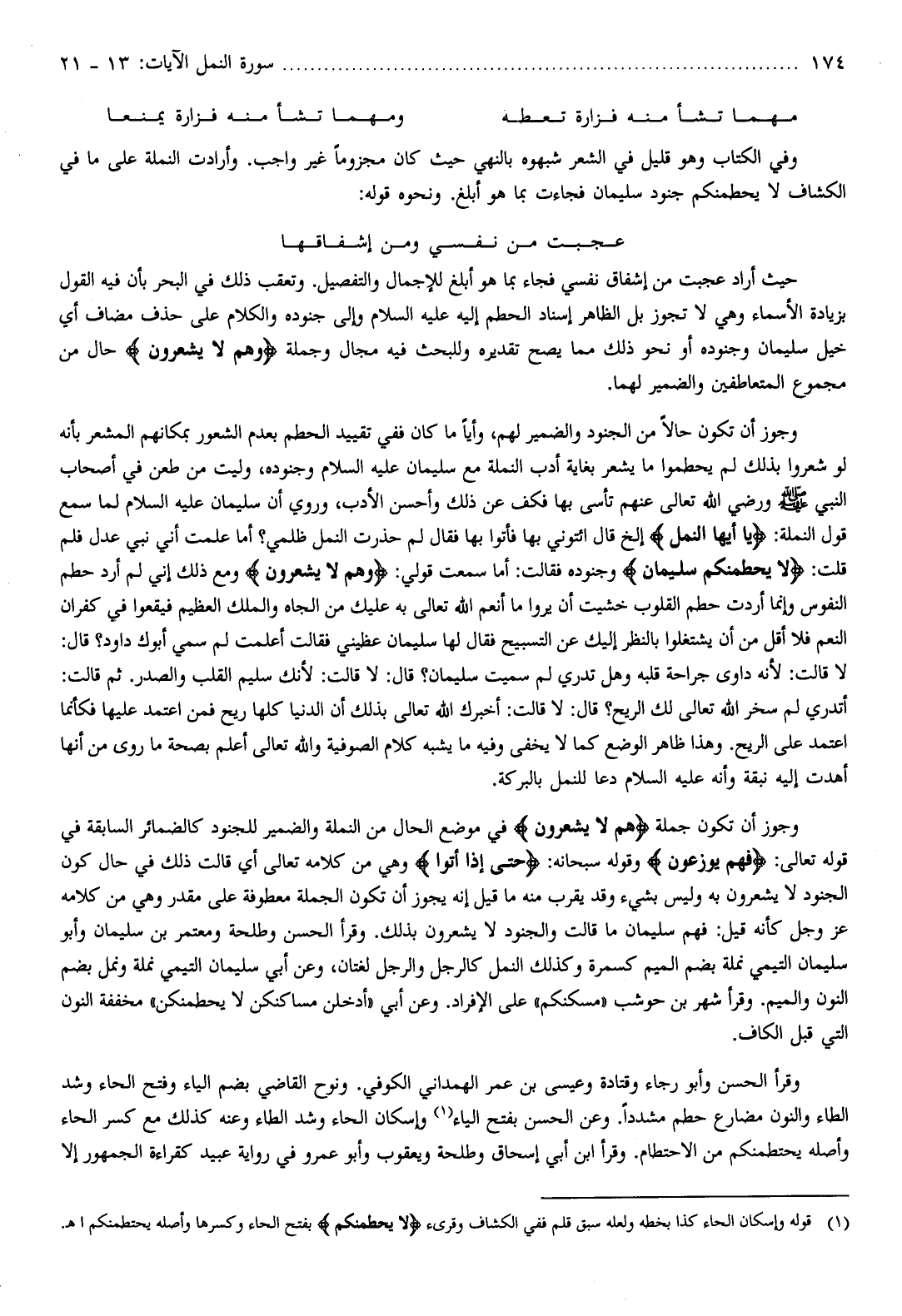 وجوز أن تكون جملة هُمْ لا يَشْعُرُونَ في موضع الحال من النملة والضمير للجنود كالضمائر السابقة في قوله تعالى: فَهُمْ يُوزَعُونَ وقوله سبحانه: حَتَّى إِذا أَتَوْا وهي من كلامه تعالى أي قالت ذلك في حال كون الجنود لا يشعرون به وليس بشيء وقد يقرب منه ما قيل إنه يجوز أن تكون الجملة معطوفة على مقدر وهي من كلامه عز وجل كأنه قيل: فهم سليمان ما قالت والجنود لا يشعرون بذلك. وقرأ الحسن وطلحة ومعتمر بن سليمان وأبو سليمان التيمي نملة بضم الميم كسمرة وكذلك النمل كالرجل والرجل لغتان، وعن أبي سليمان التيمي نملة ونمل بضم النون والميم. وقرأ شهر بن حوشب «مسكنكم» على الإفراد. وعن أبي «أدخلن مساكنكن لا يحطمنكن» مخففة النون التي قبل الكاف.