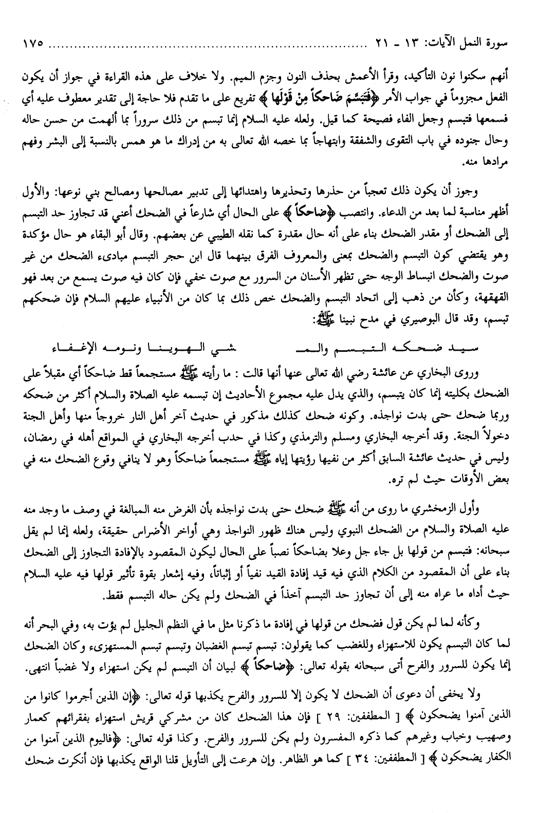 وأول الزمخشري ما روى من أنه صلّى الله عليه وسلّم ضحك حتى بدت نواجذه بأن الغرض منه المبالغة في وصف ما وجد منه عليه الصلاة والسلام من الضحك النبوي وليس هناك ظهور النواجذ وهي أواخر الأضراس حقيقة، ولعله إنما لم يقل سبحانه: فتبسم من قولها بل جاء جل وعلا بضاحكا نصبا على الحال ليكون المقصود بالإفادة التجاوز إلى الضحك بناء على أن المقصود من الكلام الذي فيه قيد إفادة القيد نفيا أو إثباتا، وفيه إشعار بقوة تأثير قولها فيه عليه السلام حيث أداه ما عراه منه إلى أن تجاوز حد التبسم آخذا في الضحك ولم يكن حاله التبسم فقط.