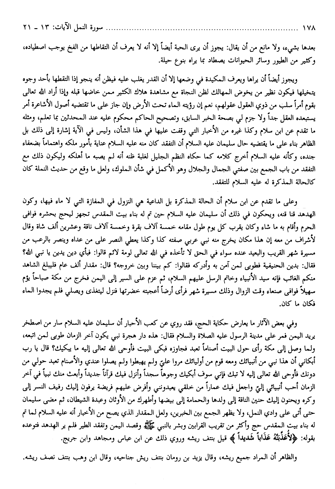 وفي بعض الآثار ما يعارض حكاية الحج، فقد روي عن كعب الأحبار أن سليمان عليه السلام سار من إصطخر يريد اليمن فمر على مدينة الرسول عليه الصلاة والسلام فقال: هذه دار هجرة نبي يكون آخر الزمان طوبى لمن اتبعه، ولما وصل إلى مكة رأى حول البيت أصناما تعبد فجاوزه فبكى البيت فأوحى الله تعالى إليه ما يبكيك؟ قال يا رب أبكاني أن هذا نبي من أنبيائك ومعه قوم من أوليائك مروا عليّ ولم يهبطوا ولم يصلوا عندي والأصنام تعبد حولي من دونك فأوحى الله تعالى إليه لا تبك فإني سوف أبكيك وجوها سجدا وأنزل فيك قرآنا جديدا وأبعث منك نبيا في آخر الزمان أحب أنبيائي إليّ واجعل فيك عمارا من خلقي يعبدونني وأفرض عليهم فريضة يرفون إليك رفيف النسر إلى وكره ويحنون إليك حنين الناقة إلى ولدها والحمامة إلى بيضها وأطهرك من الأوثان وعبدة الشيطان، ثم مضى سليمان حتى أتى على وادي النمل، ولا يظهر الجمع بين الخبرين، ولعل المقدار الذي يصح من الأخبار أنه عليه السلام لما تم له بناء بيت المقدس حج وأكثر من تقريب القرابين وبشر بالنبي صلّى الله عليه وسلّم وقصد اليمن وتفقد الطير فلم ير الهدهد فتوعده بقوله: لَأُعَذِّبَنَّهُ عَذاباً شَدِيداً قيل بنتف ريشه وروي ذلك عن ابن عباس ومجاهد وابن جريج.