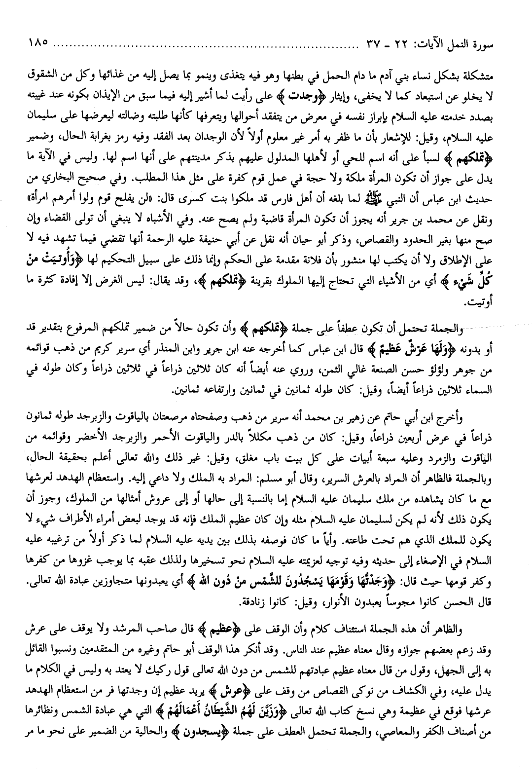 ونقل عن محمد بن جرير أنه يجوز أن تكون المرأة قاضية ولم يصح عنه. وفي الأشباه لا ينبغي أن تولى القضاء وإن صح منها بغير الحدود والقصاص، وذكر أبو حيان أنه نقل عن أبي حنيفة عليه الرحمة أنها تقضي فيما تشهد فيه لا على الإطلاق ولا أن يكتب لها منشور بأن فلانة مقدمة على الحكم وإنما ذلك على سبيل التحكيم لها وَأُوتِيَتْ مِنْ كُلِّ شَيْءٍ أي من الأشياء التي تحتاج إليها الملوك بقرينة تَمْلِكُهُمْ، وقد يقال: ليس الغرض إلا إفادة كثرة ما أوتيت.
