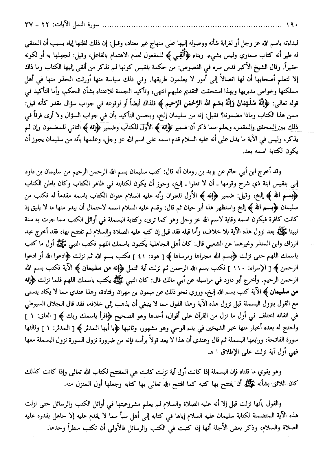 والقول بأنها نزلت قبل إلا أنه عليه الصلاة والسلام لم يعلم مشروعيتها في أوائل الكتب والرسائل حتى نزلت هذه الآية المتضمنة لكتابة سليمان عليه السلام إياها في كتابه إلى أهل سبأ مما لا يقدم عليه إلا جاهل بقدره عليه الصلاة والسلام، وذكر بعض الأجلة أنها إذا كتبت في الكتب والرسائل فالأولى أن تكتب سطرا وحدها.
