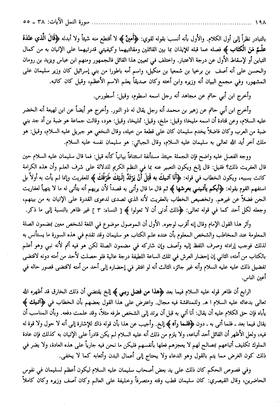 وآثر هذا القول الإمام وقال إنه أقرب لوجوه. الأول أن الموصول موضوع في اللغة لشخص معين بمضمون الصلة المعلومة عند المخاطب والشخص المعلوم بأن عنده علم الكتاب هو سليمان وقد تقدم في هذه السورة ما يستأنس به لذلك فوجب إرادته وصرف اللفظ إليه وآصف وإن شاركه في مضمون الصلة لكن هو فيه أتم لأنه نبي وهو أعلم بالكتاب من أمته، الثاني إن إحضار العرش في تلك الساعة اللطيفة درجة عالية فلو حصلت لأحد من أمته دونه لاقتضى تفضيل ذلك عليه السلام وأنه غير جائز، الثالث أنه لو افتقر في إحضاره إلى أحد من أمته لاقتضى قصور حاله في أعين الناس.