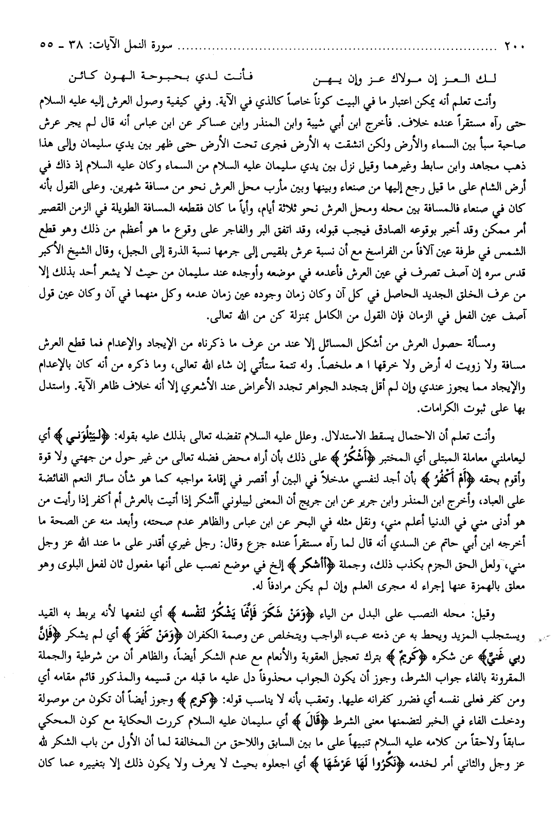 وأنت تعلم أنه يمكن اعتبار ما في البيت كونا خاصا كالذي في الآية. وفي كيفية وصول العرش إليه عليه السلام حتى رآه مستقرا عنده خلاف. فأخرج ابن أبي شيبة وابن المنذر وابن عساكر عن ابن عباس أنه قال لم يجر عرش صاحبة سبأ بين السماء والأرض ولكن انشقت به الأرض فجرى تحت الأرض حتى ظهر بين يدي سليمان وإلى هذا ذهب مجاهد وابن سابط وغيرهما وقيل نزل بين يدي سليمان عليه السلام من السماء وكان عليه السلام إذ ذاك في أرض الشام على ما قيل رجع إليها من صنعاء وبينها وبين مأرب محل العرش نحو من مسافة شهرين. وعلى القول بأنه كان في صنعاء فالمسافة بين محله ومحل العرش نحو ثلاثة أيام، وأيا ما كان فقطعه المسافة الطويلة في الزمن القصير أمر ممكن وقد أخبر بوقوعه الصادق فيجب قبوله، وقد اتفق البر والفاجر على وقوع ما هو أعظم من ذلك وهو قطع الشمس في طرفة عين آلافا من الفراسخ مع أن نسبة عرش بلقيس إلى جرمها نسبة الذرة إلى الجبل، وقال الشيخ الأكبر قدس سره إن آصف تصرف في عين العرش فأعدمه في موضعه وأوجده عند سليمان من حيث لا يشعر أحد بذلك إلا من عرف الخلق الجديد الحاصل في كل آن وكان زمان وجوده عين زمان عدمه وكل منهما في آن وكان عين قول آصف عين الفعل في الزمان فإن القول من الكامل بمنزلة كن من الله تعالى.