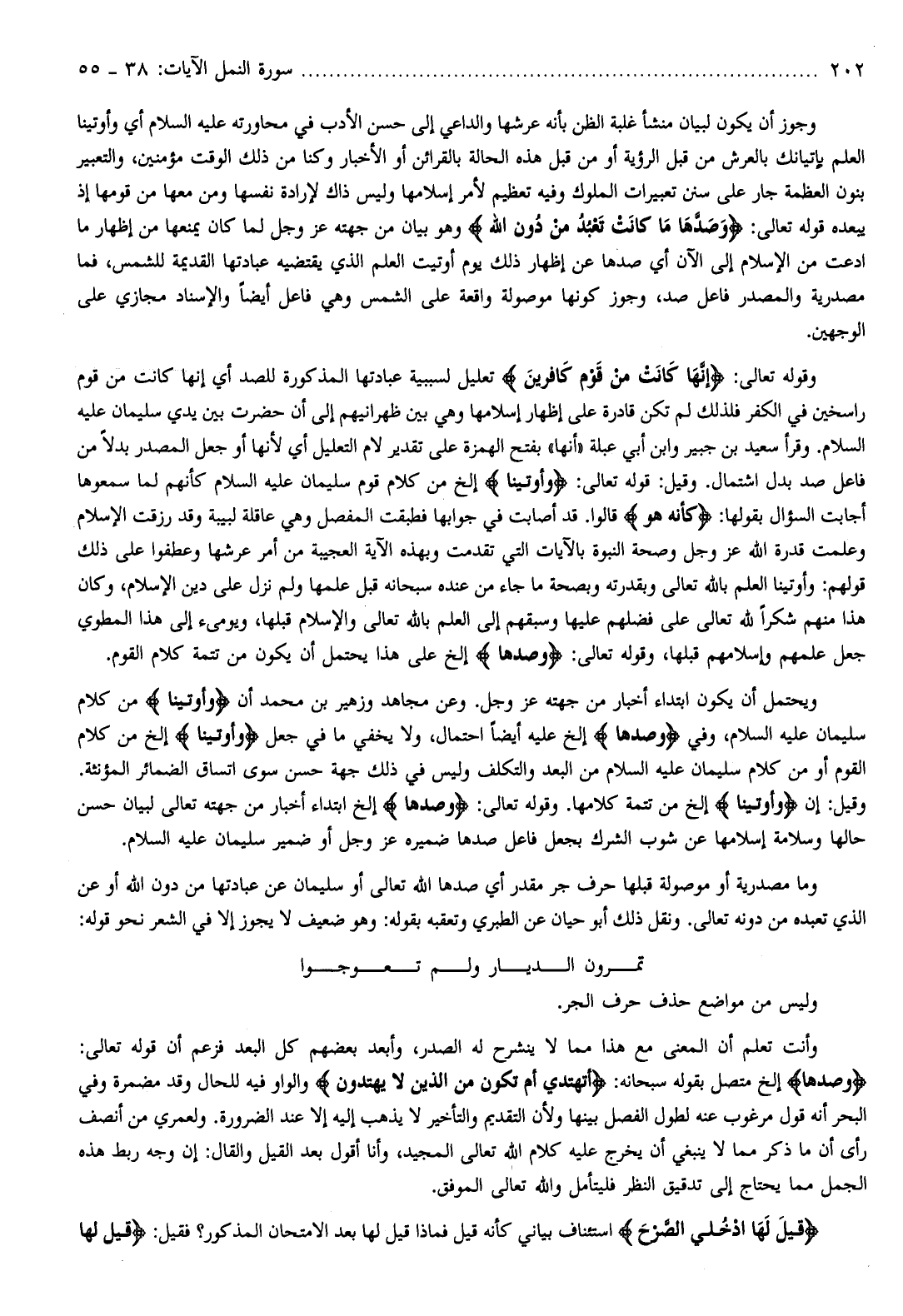 وقوله تعالى: إِنَّها كانَتْ مِنْ قَوْمٍ كافِرِينَ تعليل لسببية عبادتها المذكورة للصد أي إنها كانت من قوم راسخين في الكفر فلذلك لم تكن قادرة على إظهار إسلامها وهي بين ظهرانيهم إلى أن حضرت بين يدي سليمان عليه السلام. وقرأ سعيد بن جبير وابن أبي عبلة «أنها» بفتح الهمزة على تقدير لام التعليل أي لأنها أو جعل المصدر بدلا من فاعل صد بدل اشتمال. وقيل: قوله تعالى: وَأُوتِينَا إلخ من كلام قوم سليمان عليه السلام كأنهم لما سمعوها أجابت السؤال بقولها: كَأَنَّهُ هُوَ قالوا. قد أصابت في جوابها فطبقت المفصل وهي عاقلة لبيبة وقد رزقت الإسلام وعلمت قدرة الله عز وجل وصحة النبوة بالآيات التي تقدمت وبهذه الآية العجيبة من أمر عرشها وعطفوا على ذلك قولهم: وأوتينا العلم بالله تعالى وبقدرته وبصحة ما جاء من عنده سبحانه قبل علمها ولم نزل على دين الإسلام، وكان هذا منهم شكرا لله تعالى على فضلهم عليها وسبقهم إلى العلم بالله تعالى والإسلام قبلها، ويومىء إلى هذا المطوي جعل علمهم وإسلامهم قبلها، وقوله تعالى: وَصَدَّها إلخ على هذا يحتمل أن يكون من تتمة كلام القوم.