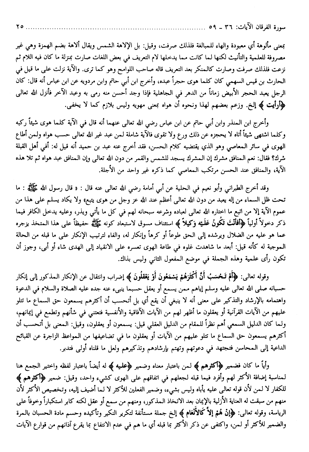 وأيا ما كان فضمير أَكْثَرَهُمْ لمن باعتبار معناه وضمير عَلَيْهِ له أيضا باعتبار لفظه واختير الجمع هنا لمناسبة إضافة الأكثر لهم وأفرد فيما قبله لجعلهم في اتفاقهم على الهوى كشيء واحد، وقيل: ضمير أَكْثَرَهُمْ للكفار لا لمن لأن قوله تعالى عليه يأباه وليس بشيء، وضمير الفعلين للأكثر لا لما أضيف إليه، وتخصيص الأكثر لأن منهم من سبقت له العناية الأزلية بالإيمان بعد الاتخاذ المذكور، ومنهم من سمع أو عقل لكنه كابر استكبارا وخوفا على الرياسة، وقوله تعالى: إِنْ هُمْ إِلَّا كَالْأَنْعامِ إلخ جملة مستأنفة لتكرير النكير وتأكيده وحسم مادة الحسبان بالمرة والضمير للأكثر أو لمن، واكتفى عن ذكر الأكثر بما قبله أي ما هم في عدم الانتفاع بما يقرع آذانهم من قوارع الآيات