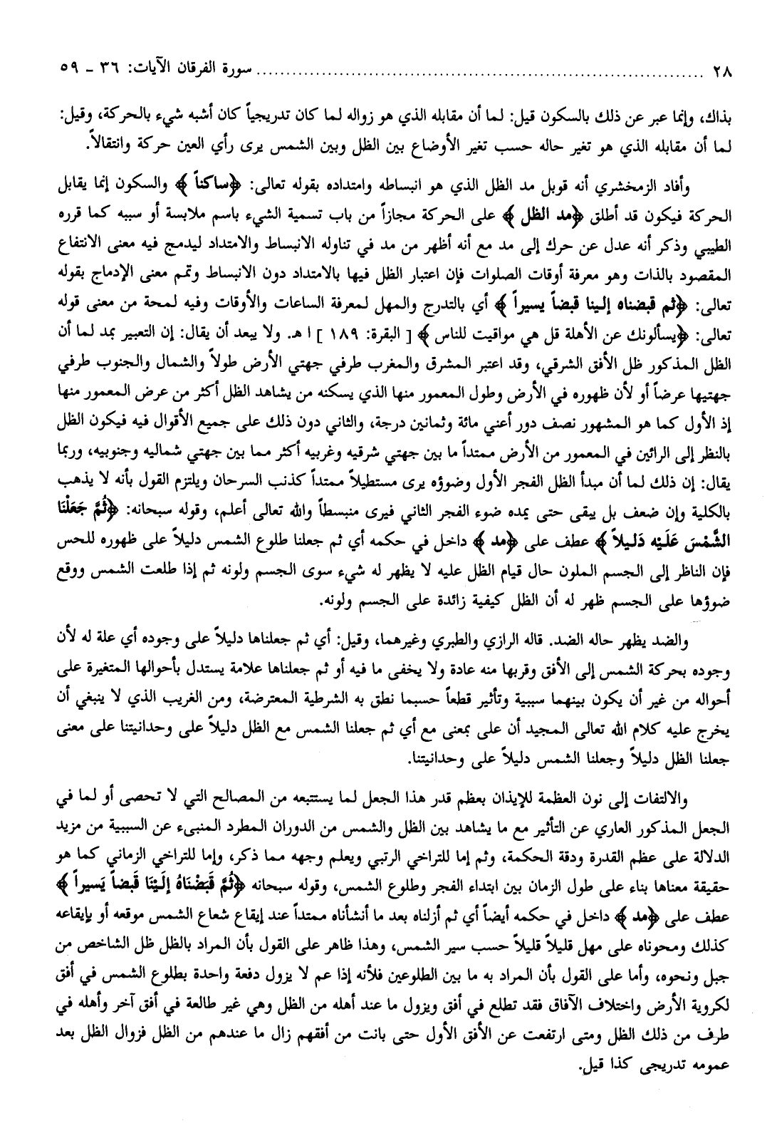 وأفاد الزمخشري أنه قوبل مد الظل الذي هو انبساطه وامتداده بقوله تعالى: ساكِناً والسكون إنما يقابل الحركة فيكون قد أطلق مَدَّ الظِّلَّ على الحركة مجازا من باب تسمية الشيء باسم ملابسة أو سببه كما قرره الطيبي وذكر أنه عدل عن حرك إلى مد مع أنه أظهر من مد في تناوله الانبساط والامتداد ليدمج فيه معنى الانتفاع المقصود بالذات وهو معرفة أوقات الصلوات فإن اعتبار الظل فيها بالامتداد دون الانبساط وتمم معنى الإدماج بقوله تعالى: ثُمَّ قَبَضْناهُ إِلَيْنا قَبْضاً يَسِيراً أي بالتدرج والمهل لمعرفة الساعات والأوقات وفيه لمحة من معنى قوله تعالى: يَسْئَلُونَكَ عَنِ الْأَهِلَّةِ قُلْ هِيَ مَواقِيتُ لِلنَّاسِ [البقرة: 189] اهـ. ولا يبعد أن يقال: إن التعبير بمد لما أن الظل المذكور ظل الأفق الشرقي، وقد اعتبر المشرق والمغرب طرفي جهتي الأرض طولا والشمال والجنوب طرفي جهتيها عرضا أو لأن ظهوره في الأرض وطول المعمور منها الذي يسكنه من يشاهد الظل أكثر من عرض المعمور منها إذ الأول كما هو المشهور نصف دور أعني مائة وثمانين درجة، والثاني دون ذلك على جميع الأقوال فيه فيكون الظل بالنظر إلى الرائين في المعمور من الأرض ممتدا ما بين جهتي شرقيه وغربيه أكثر مما بين جهتي شماليه وجنوبيه، وربما يقال: إن ذلك لما أن مبدأ الظل الفجر الأول وضوؤه يرى مستطيلا ممتدا كذنب السرحان ويلتزم القول بأنه لا يذهب بالكلية وإن ضعف بل يبقى حتى يمده ضوء الفجر الثاني فيرى منبسطا والله تعالى أعلم، وقوله سبحانه: ثُمَّ جَعَلْنَا الشَّمْسَ عَلَيْهِ دَلِيلًا عطف على مَدَّ داخل في حكمه أي ثم جعلنا طلوع الشمس دليلا على ظهوره للحس فإن الناظر إلى الجسم الملون حال قيام الظل عليه لا يظهر له شيء سوى الجسم ولونه ثم إذا طلعت الشمس ووقع ضوؤها على الجسم ظهر له أن الظل كيفية زائدة على الجسم ولونه.