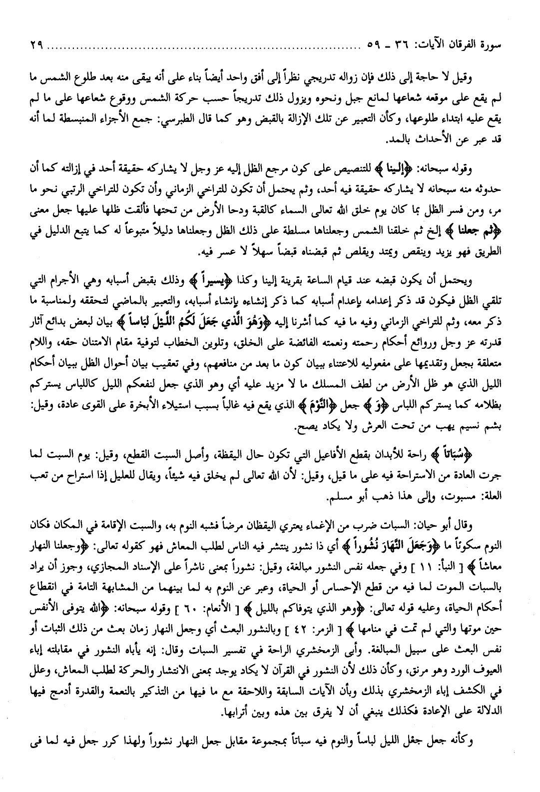 وقال أبو حيان: السبات ضرب من الإغماء يعتري اليقظان مرضا فشبه النوم به، والسبت الإقامة في المكان فكان النوم سكونا ما وَجَعَلَ النَّهارَ نُشُوراً أي ذا نشور ينتشر فيه الناس لطلب المعاش فهو كقوله تعالى: وَجَعَلْنَا النَّهارَ مَعاشاً [النبأ: 11] وفي جعله نفس النشور مبالغة، وقيل: نشورا بمعنى ناشرا على الإسناد المجازي، وجوز أن يراد بالسبات الموت لما فيه من قطع الإحساس أو الحياة، وعبر عن النوم به لما بينهما من المشابهة التامة في انقطاع أحكام الحياة، وعليه قوله تعالى: وَهُوَ الَّذِي يَتَوَفَّاكُمْ بِاللَّيْلِ [الأنعام: 60] وقوله سبحانه: اللَّهُ يَتَوَفَّى الْأَنْفُسَ حِينَ مَوْتِها وَالَّتِي لَمْ تَمُتْ فِي مَنامِها [الزمر: 42] وبالنشور البعث أي وجعل النهار زمان بعث من ذلك الثبات أو نفس البعث على سبيل المبالغة. وأبي الزمخشري الراحة في تفسير السبات وقال: إنه يأباه النشور في مقابلته إباء العيوف الورد وهو مرنق، وكأن ذلك لأن النشور في القرآن لا يكاد يوجد بمعنى الانتشار والحركة لطلب المعاش، وعلل في الكشف إباء الزمخشري بذلك وبأن الآيات السابقة واللاحقة مع ما فيها من التذكير بالنعمة والقدرة أدمج فيها الدلالة على الإعادة فكذلك ينبغي أن لا يفرق بين هذه وبين أترابها.