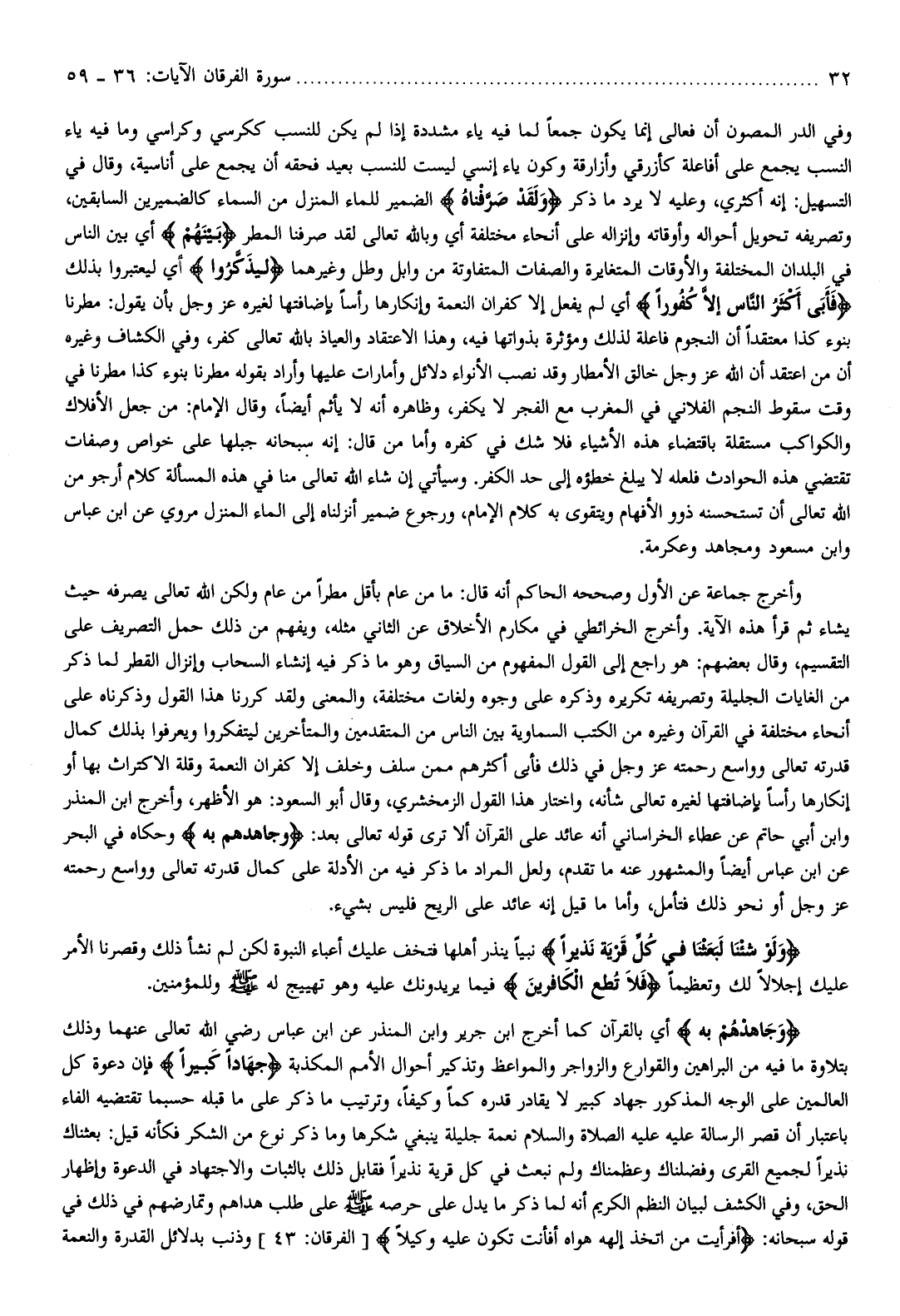 وفي الدر المصون أن فعالى إنما يكون جمعا لما فيه ياء مشددة إذا لم يكن للنسب ككرسي وكراسي وما فيه ياء النسب يجمع على أفاعلة كأزرقي وأزارقة وكون ياء إنسي ليست للنسب بعيد فحقه أن يجمع على أناسية، وقال في التسهيل: إنه أكثري، وعليه لا يرد ما ذكر وَلَقَدْ صَرَّفْناهُ الضمير للماء المنزل من السماء كالضميرين السابقين، وتصريفه تحويل أحواله وأوقاته وإنزاله على أنحاء مختلفة أي وبالله تعالى لقد صرفنا المطر بَيْنَهُمْ أي بين الناس في البلدان المختلفة والأوقات المتغايرة والصفات المتفاوتة من وابل وطل وغيرهما لِيَذَّكَّرُوا أي ليعتبروا بذلك فَأَبى أَكْثَرُ النَّاسِ إِلَّا كُفُوراً أي لم يفعل إلا كفران النعمة وإنكارها رأسا بإضافتها لغيره عز وجل بأن يقول: مطرنا بنوء كذا معتقدا أن النجوم فاعلة لذلك ومؤثرة بذواتها فيه، وهذا الاعتقاد والعياذ بالله تعالى كفر، وفي الكشاف وغيره أن من اعتقد أن الله عز وجل خالق الأمطار وقد نصب الأنواء دلائل وأمارات عليها وأراد بقوله مطرنا بنوء كذا مطرنا في وقت سقوط النجم الفلاني في المغرب مع الفجر لا يكفر، وظاهره أنه لا يأثم أيضا، وقال الإمام: من جعل الأفلاك والكواكب مستقلة باقتضاء هذه الأشياء فلا شك في كفره وأما من قال: إنه سبحانه جبلها على خواص وصفات تقتضي هذه الحوادث فلعله لا يبلغ خطؤه إلى حد الكفر. وسيأتي إن شاء الله تعالى منا في هذه المسألة كلام أرجو من الله تعالى أن تستحسنه ذوو الأفهام ويتقوى به كلام الإمام، ورجوع ضمير أنزلناه إلى الماء المنزل مروي عن ابن عباس وابن مسعود ومجاهد وعكرمة.