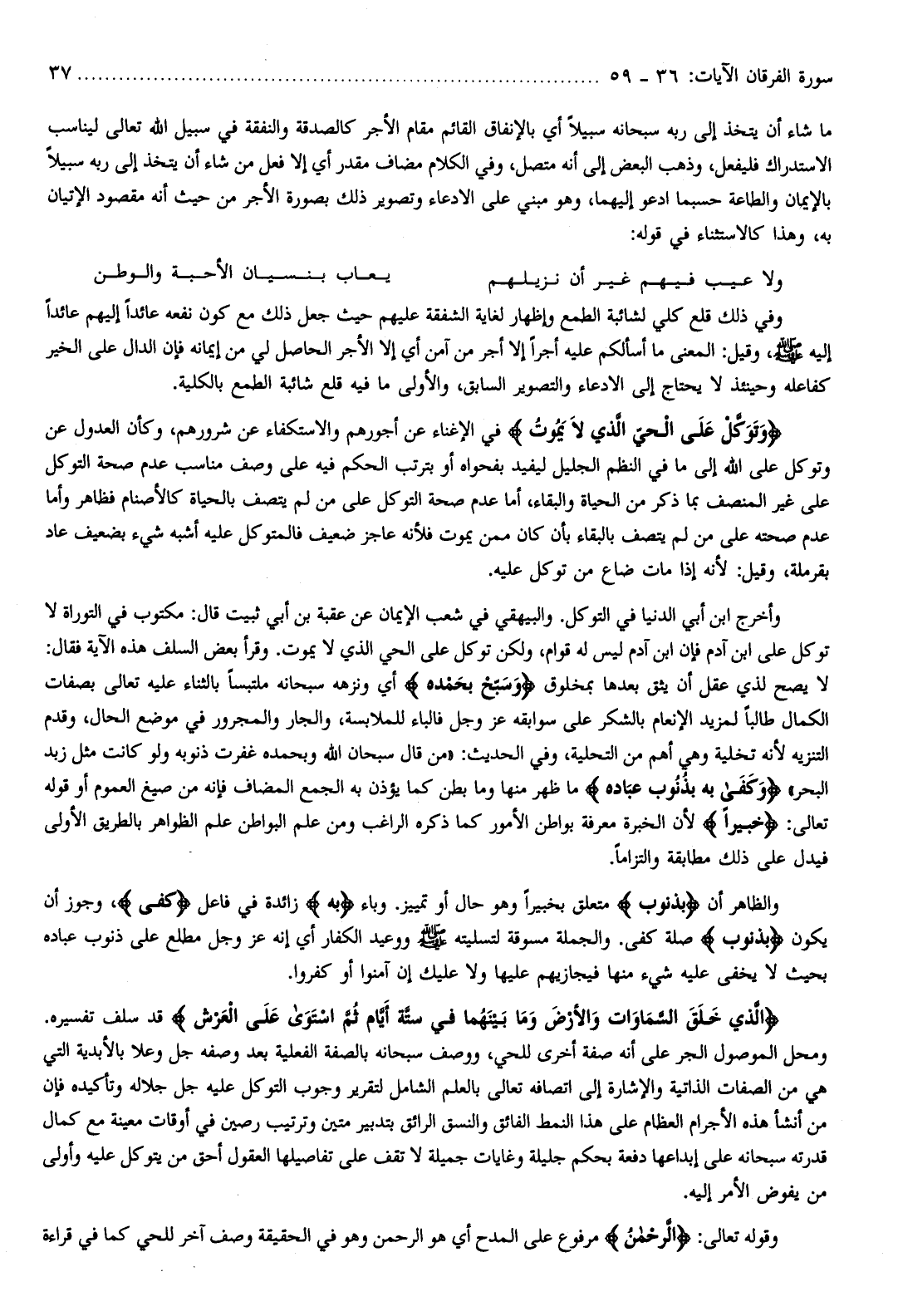 وَتَوَكَّلْ عَلَى الْحَيِّ الَّذِي لا يَمُوتُ في الإغناء عن أجورهم والاستكفاء عن شرورهم، وكأن العدول عن وتوكل على الله إلى ما في النظم الجليل ليفيد بفحواه أو بترتب الحكم فيه على وصف مناسب عدم صحة التوكل على غير المنصف بما ذكر من الحياة والبقاء، أما عدم صحة التوكل على من لم يتصف بالحياة كالأصنام فظاهر وأما عدم صحته على من لم يتصف بالبقاء بأن كان ممن يموت فلأنه عاجز ضعيف فالمتوكل عليه أشبه شيء بضعيف عاد بقرملة، وقيل: لأنه إذا مات ضاع من توكل عليه.