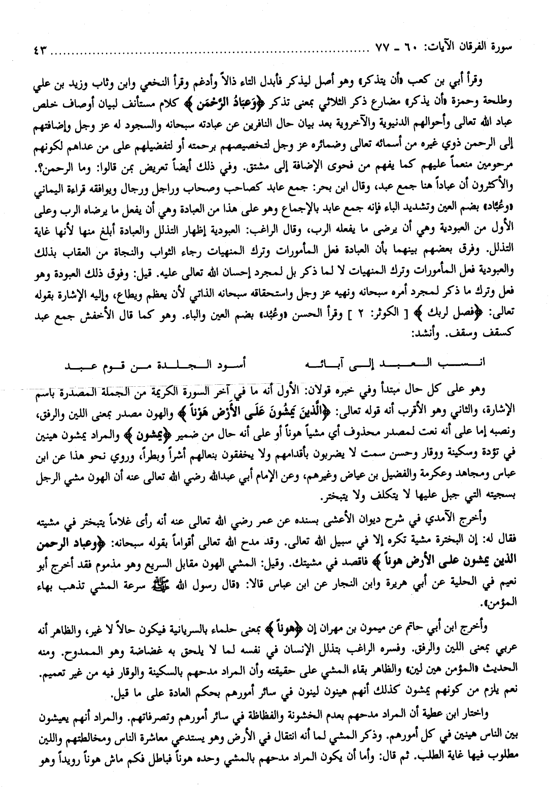 وقرأ أبي بن كعب «أن يتذكر» وهو أصل ليذكر فأبدل التاء ذالا وأدغم وقرأ النخعي وابن وثاب وزيد بن علي وطلحة وحمزة «أن يذكر» مضارع ذكر الثلاثي بمعنى تذكر وَعِبادُ الرَّحْمنِ كلام مستأنف لبيان أوصاف خلص عباد الله تعالى وأحوالهم الدنيوية والأخروية بعد بيان حال النافرين عن عبادته سبحانه والسجود له عز وجل وإضافتهم إلى الرحمن ذوي غيره من أسمائه تعالى وضمائره عز وجل لتخصيصهم برحمته أو لتفضيلهم على من عداهم لكونهم مرحومين منعما عليهم كما يفهم من فحوى الإضافة إلى مشتق. وفي ذلك أيضا تعريض بمن قالوا: وما الرحمن؟.