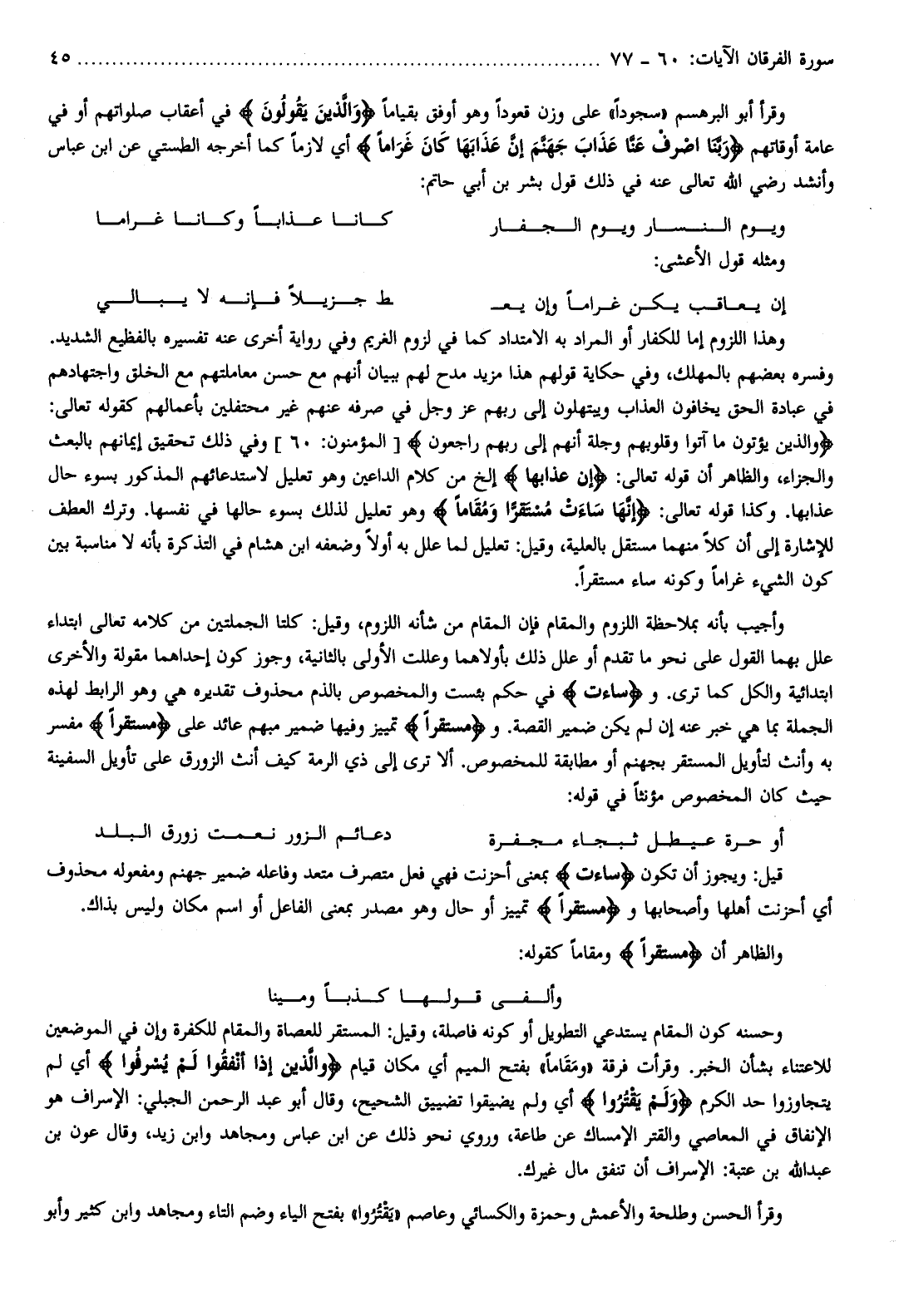 وألفى قولها كذبا ومينا وحسنه كون المقام يستدعي التطويل أو كونه فاصلة، وقيل: المستقر للعصاة والمقام للكفرة وإن في الموضعين للاعتناء بشأن الخبر. وقرأت فرقة «ومقاما» بفتح الميم أي مكان قيام وَالَّذِينَ إِذا أَنْفَقُوا لَمْ يُسْرِفُوا أي لم يتجاوزوا حد الكرم وَلَمْ يَقْتُرُوا أي ولم يضيقوا تضييق الشحيح، وقال أبو عبد الرحمن الجبلي: الإسراف هو الإنفاق في المعاصي والقتر الإمساك عن طاعة، وروي نحو ذلك عن ابن عباس ومجاهد وابن زيد، وقال عون بن عبد الله بن عتبة: الإسراف أن تنفق مال غيرك.
