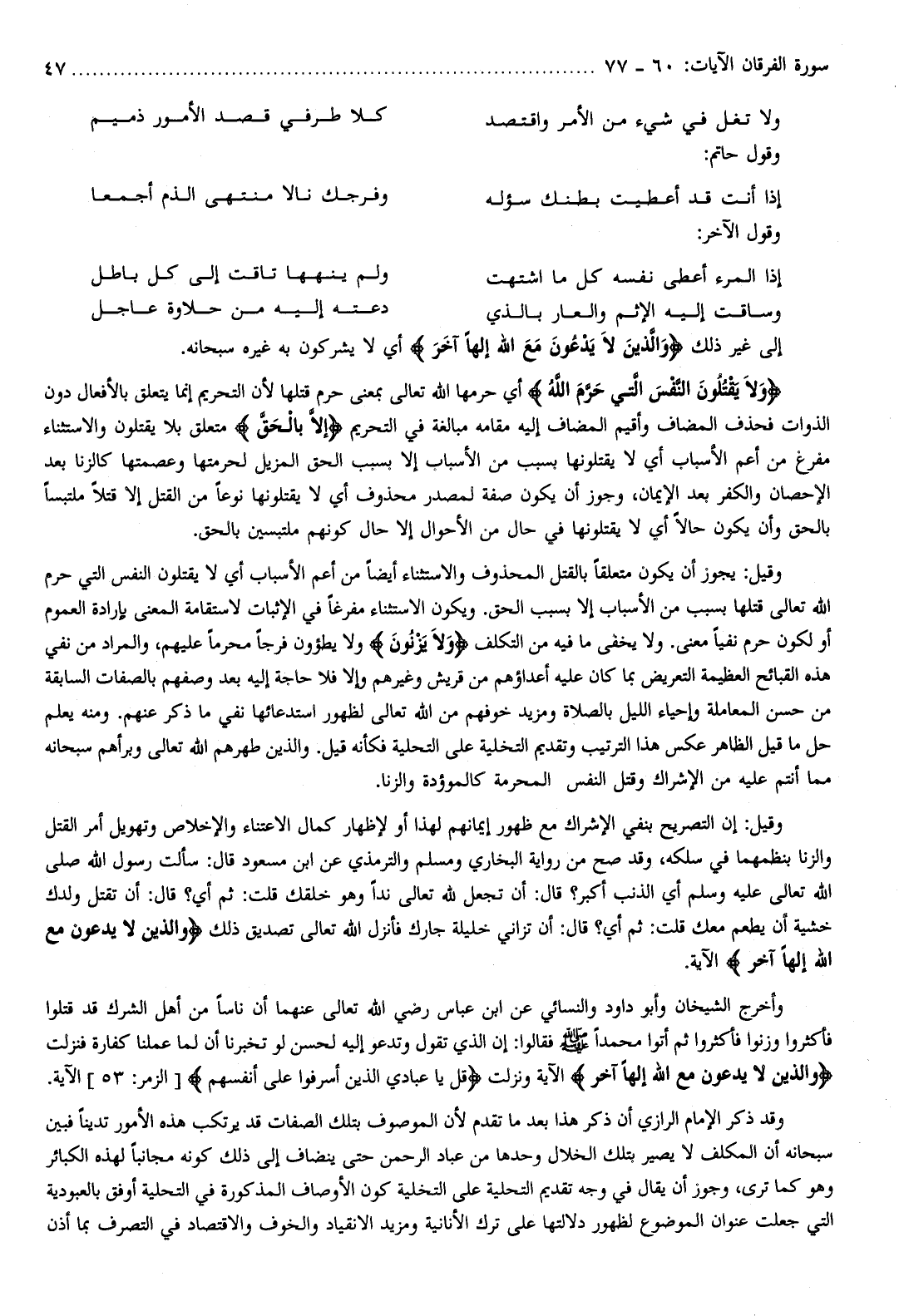 وقد صح من رواية البخاري ومسلم والترمذي عن ابن مسعود قال: سألت رسول الله صلى الله تعالى عليه وسلم أي الذنب أكبر؟ قال: أن تجعل لله تعالى ندا وهو خلقك قلت: ثم أي؟ قال: أن تقتل ولدك خشية أن يطعم معك قلت: ثم أي؟ قال: أن تزاني خليلة جارك فأنزل الله تعالى تصديق ذلك وَالَّذِينَ لا يَدْعُونَ مَعَ اللَّهِ إِلهاً آخَرَ الآية.