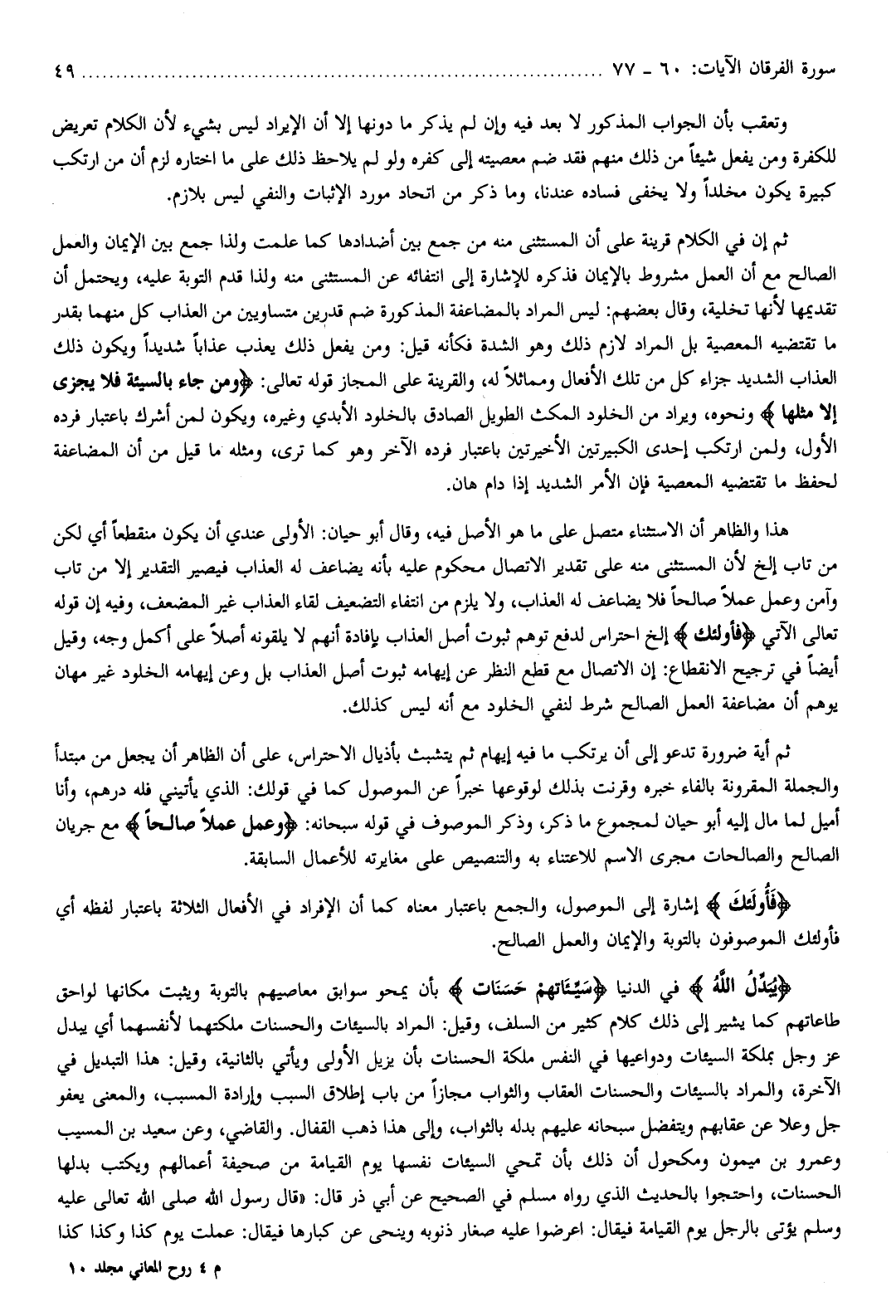 ثم إن في الكلام قرينة على أن المستثنى منه من جمع بين أضدادها كما علمت ولذا جمع بين الإيمان والعمل الصالح مع أن العمل مشروط بالإيمان فذكره للإشارة إلى انتفائه عن المستثنى منه ولذا قدم التوبة عليه، ويحتمل أن تقديمها لأنها تخلية، وقال بعضهم: ليس المراد بالمضاعفة المذكورة ضم قدرين متساويين من العذاب كل منهما بقدر ما تقتضيه المعصية بل المراد لازم ذلك وهو الشدة فكأنه قيل: ومن يفعل ذلك يعذب عذابا شديدا ويكون ذلك العذاب الشديد جزاء كل من تلك الأفعال ومماثلا له، والقرينة على المجاز قوله تعالى: وَمَنْ جاءَ بِالسَّيِّئَةِ فَلا يُجْزى إِلَّا مِثْلَها ونحوه، ويراد من الخلود المكث الطويل الصادق بالخلود الأبدي وغيره، ويكون لمن أشرك باعتبار فرده الأول، ولمن ارتكب إحدى الكبيرتين الأخيرتين باعتبار فرده الآخر وهو كما ترى، ومثله ما قيل من أن المضاعفة لحفظ ما تقتضيه المعصية فإن الأمر الشديد إذا دام هان.