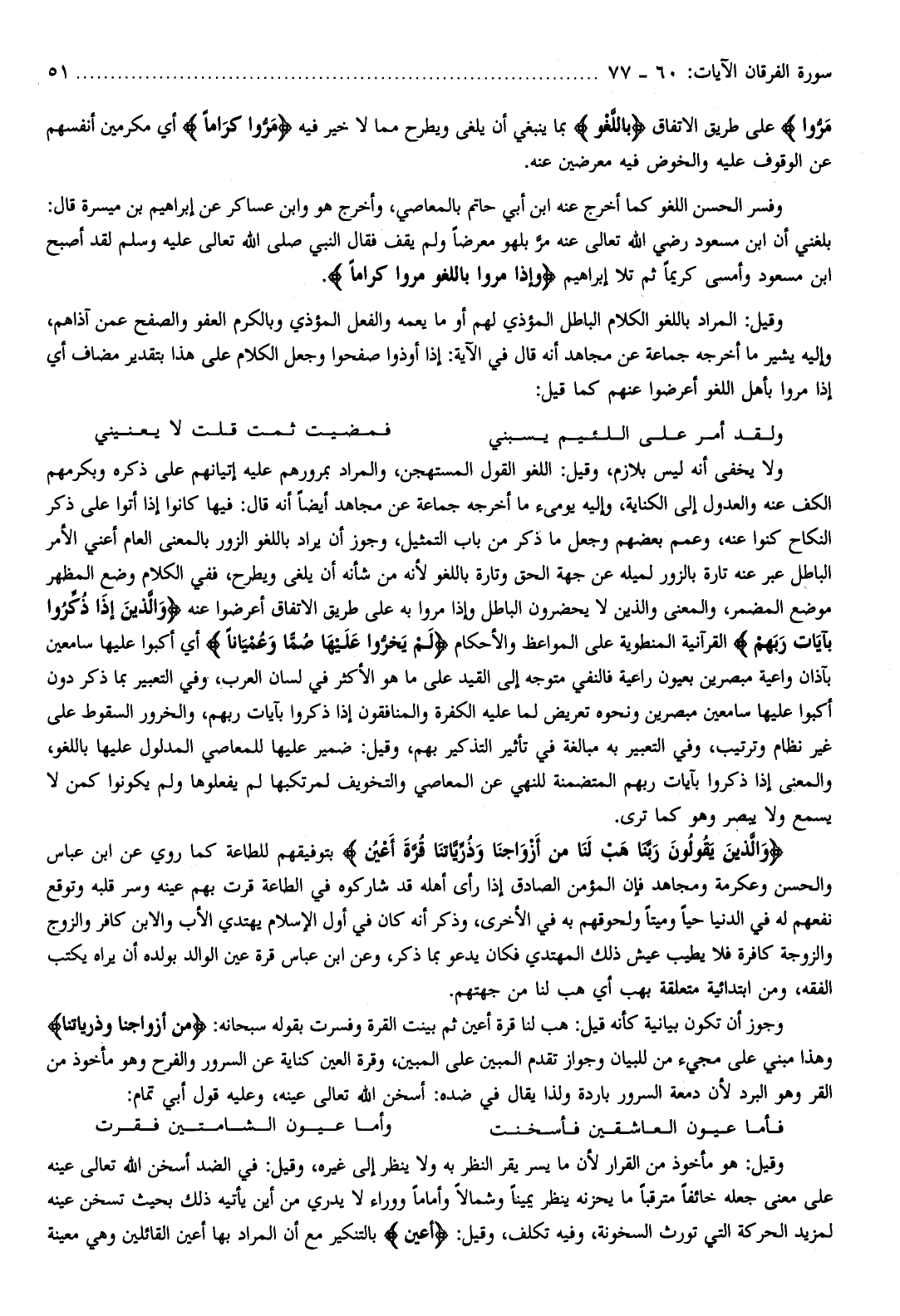 بلغني أن ابن مسعود رضي الله تعالى عنه مرّ بلهو معرضا ولم يقف فقال النبي صلّى الله تعالى عليه وسلّم لقد أصبح ابن مسعود وأمسى كريما ثم تلا إبراهيم وَإِذا مَرُّوا بِاللَّغْوِ مَرُّوا كِراماً.
