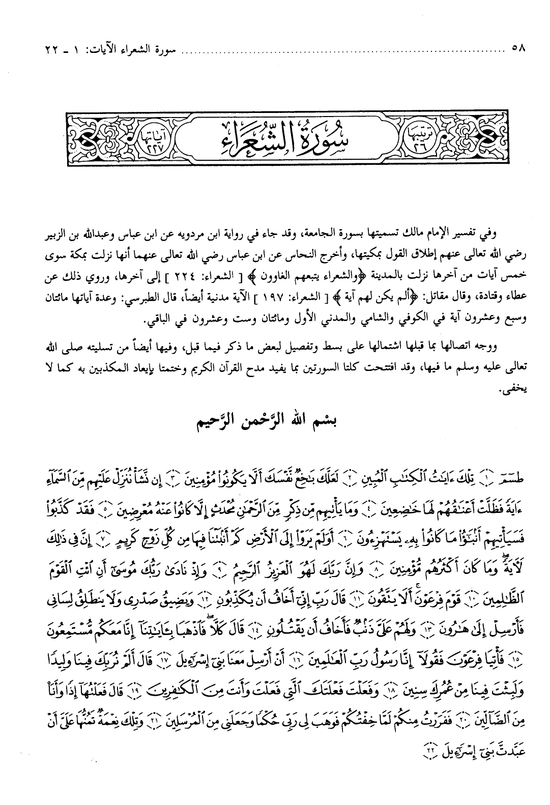 وفي تفسير الإمام مالك تسميتها بسورة الجامعة، وقد جاء في رواية ابن مردويه عن ابن عباس وعبد الله بن الزبير رضي الله تعالى عنهم إطلاق القول بمكيتها، وأخرج النحاس عن ابن عباس رضي الله تعالى عنهما أنها نزلت بمكة سوى خمس آيات من آخرها نزلت بالمدينة وَالشُّعَراءُ يَتَّبِعُهُمُ الْغاوُونَ [الشعراء: 224] إلى آخرها، وروي ذلك عن عطاء وقتادة، وقال مقاتل: أَوَلَمْ يَكُنْ لَهُمْ آيَةً [الشعراء: 197] الآية مدنية أيضا، قال الطبرسي: وعدة آياتها مائتان وسبع وعشرون آية في الكوفي والشامي والمدني الأول ومائتان وست وعشرون في الباقي.