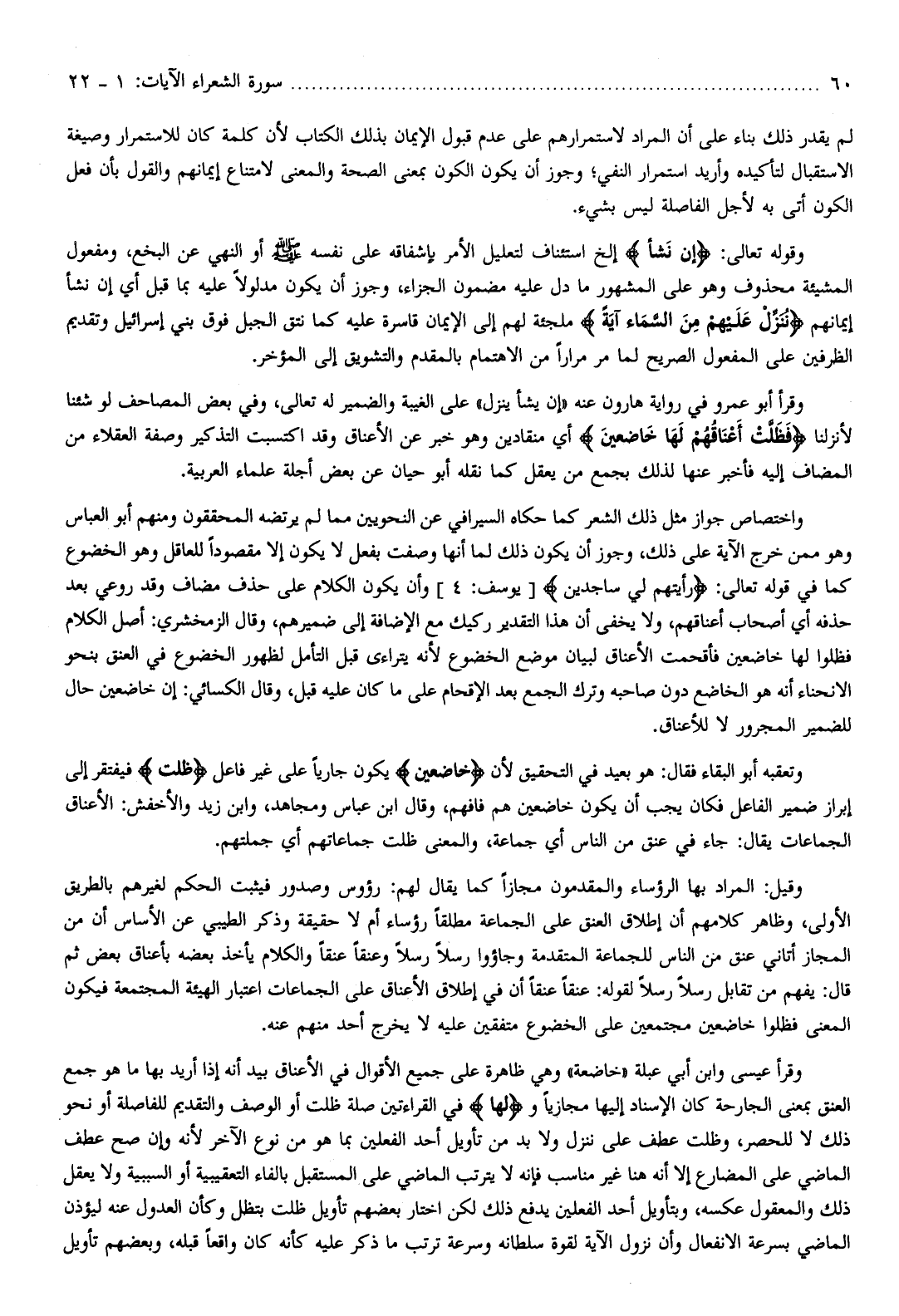 واختصاص جواز مثل ذلك الشعر كما حكاه السيرافي عن النحويين مما لم يرتضه المحققون ومنهم أبو العباس وهو ممن خرج الآية على ذلك، وجوز أن يكون ذلك لما أنها وصفت بفعل لا يكون إلا مقصودا للعاقل وهو الخضوع كما في قوله تعالى: رَأَيْتُهُمْ لِي ساجِدِينَ [يوسف: 4] وأن يكون الكلام على حذف مضاف وقد روعي بعد حذفه أي أصحاب أعناقهم، ولا يخفى أن هذا التقدير ركيك مع الإضافة إلى ضميرهم، وقال الزمخشري: أصل الكلام فظلوا لها خاضعين فأقحمت الأعناق لبيان موضع الخضوع لأنه يتراءى قبل التأمل لظهور الخضوع في العنق بنحو الانحناء أنه هو الخاضع دون صاحبه وترك الجمع بعد الإقحام على ما كان عليه قبل، وقال الكسائي: إن خاضعين حال للضمير المجرور لا للأعناق.
