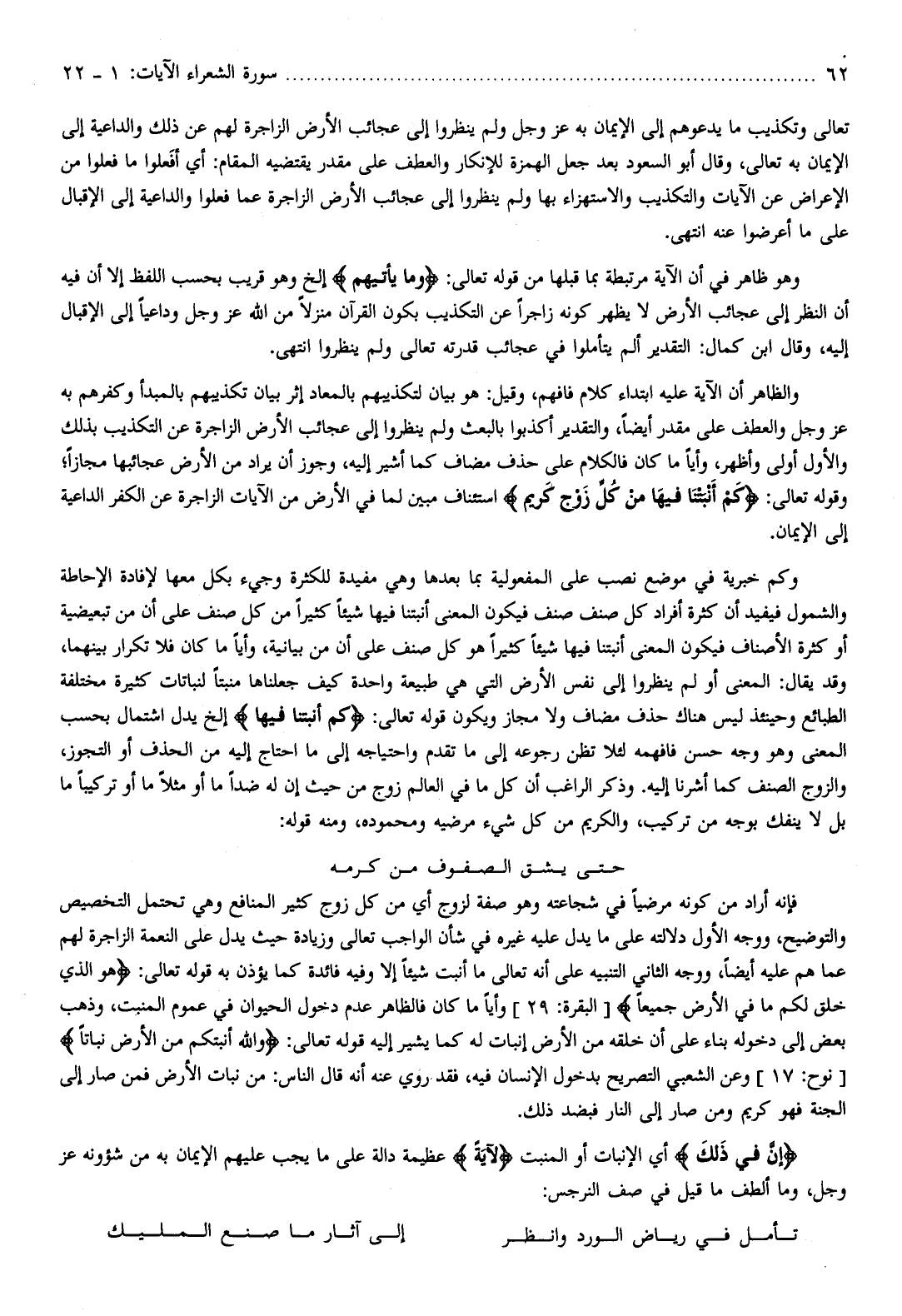 حتى يشق الصفوف من كرمه فإنه أراد من كونه مرضيا في شجاعته وهو صفة لزوج أي من كل زوج كثير المنافع وهي تحتمل التخصيص والتوضيح، ووجه الأول دلالته على ما يدل عليه غيره في شأن الواجب تعالى وزيادة حيث يدل على النعمة الزاجرة لهم عما هم عليه أيضا، ووجه الثاني التنبيه على أنه تعالى ما أنبت شيئا إلا وفيه فائدة كما يؤذن به قوله تعالى: هُوَ الَّذِي خَلَقَ لَكُمْ ما فِي الْأَرْضِ جَمِيعاً [البقرة: 29] وأيا ما كان فالظاهر عدم دخول الحيوان في عموم المنبت، وذهب بعض إلى دخوله بناء على أن خلقه من الأرض إنبات له كما يشير إليه قوله تعالى: وَاللَّهُ أَنْبَتَكُمْ مِنَ الْأَرْضِ نَباتاً [نوح: 17] وعن الشعبي التصريح بدخول الإنسان فيه، فقد روي عنه أنه قال الناس: من نبات الأرض فمن صار إلى الجنة فهو كريم ومن صار إلى النار فبضد ذلك.