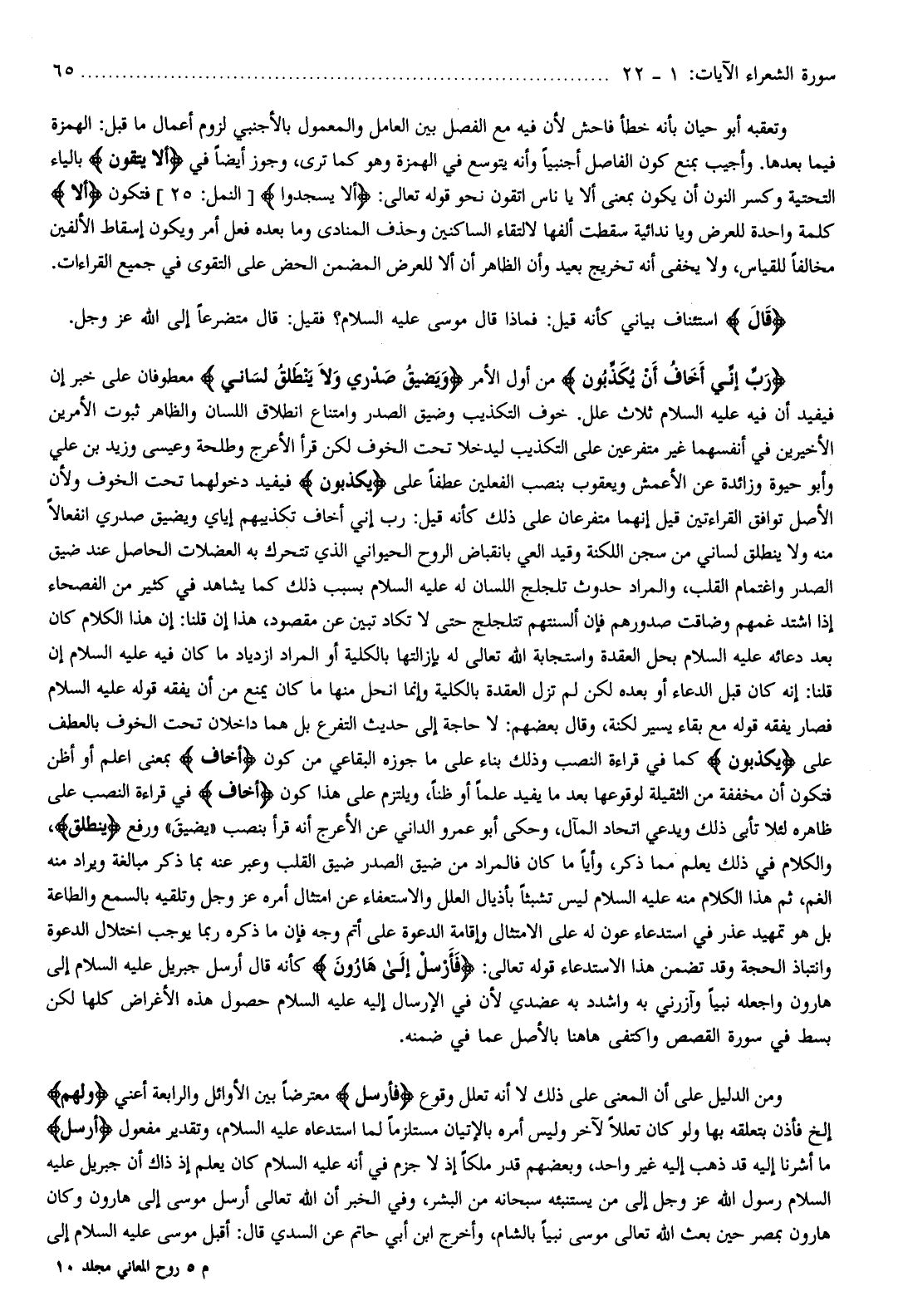 رَبِّ إِنِّي أَخافُ أَنْ يُكَذِّبُونِ من أول الأمر وَيَضِيقُ صَدْرِي وَلا يَنْطَلِقُ لِسانِي معطوفان على خبر إن فيفيد أن فيه عليه السلام ثلاث علل. خوف التكذيب وضيق الصدر وامتناع انطلاق اللسان والظاهر ثبوت الأمرين الأخيرين في أنفسهما غير متفرعين على التكذيب ليدخلا تحت الخوف لكن قرأ الأعرج وطلحة وعيسى وزيد بن علي وأبو حيوة وزائدة عن الأعمش ويعقوب بنصب الفعلين عطفا على يُكَذِّبُونِ فيفيد دخولهما تحت الخوف ولأن الأصل توافق القراءتين قيل إنهما متفرعان على ذلك كأنه قيل: رب إني أخاف تكذيبهم إياي ويضيق صدري انفعالا منه ولا ينطلق لساني من سجن اللكنة وقيد العي بانقباض الروح الحيواني الذي تتحرك به العضلات الحاصل عند ضيق الصدر واغتمام القلب، والمراد حدوث تلجلج اللسان له عليه السلام بسبب ذلك كما يشاهد في كثير من الفصحاء إذا اشتد غمهم وضاقت صدورهم فإن ألسنتهم تتلجلج حتى لا تكاد تبين عن مقصود، هذا إن قلنا: إن هذا الكلام كان بعد دعائه عليه السلام بحل العقدة واستجابة الله تعالى له بإزالتها بالكلية أو المراد ازدياد ما كان فيه عليه السلام إن قلنا: إنه كان قبل الدعاء أو بعده لكن لم تزل العقدة بالكلية وإنما انحل منها ما كان يمنع من أن يفقه قوله عليه السلام فصار يفقه قوله مع بقاء يسير لكنة، وقال بعضهم: لا حاجة إلى حديث التفرع بل هما داخلان تحت الخوف بالعطف على يُكَذِّبُونِ كما في قراءة النصب وذلك بناء على ما جوزه البقاعي من كون أَخافُ بمعنى اعلم أو أظن فتكون أن مخففة من الثقيلة لوقوعها بعد ما يفيد علما أو ظنا، ويلتزم على هذا كون أَخافُ في قراءة النصب على ظاهره لئلا تأبى ذلك ويدعي اتحاد المآل، وحكى أبو عمرو الداني عن الأعرج أنه قرأ بنصب «يضيق» ورفع يَنْطَلِقُ، والكلام في ذلك يعلم مما ذكر، وأيا ما كان فالمراد من ضيق الصدر ضيق القلب وعبر عنه بما ذكر مبالغة ويراد منه الغم، ثم هذا الكلام منه عليه السلام ليس تشبثا بأذيال العلل والاستعفاء عن امتثال أمره عز وجل وتلقيه بالسمع والطاعة بل هو تمهيد عذر في استدعاء عون له على الامتثال وإقامة الدعوة على أتم وجه فإن ما ذكره ربما يوجب اختلال الدعوة وانتباذ الحجة وقد تضمن هذا الاستدعاء قوله تعالى: فَأَرْسِلْ إِلى هارُونَ كأنه قال أرسل جبريل عليه السلام إلى هارون واجعله نبيا وآزرني به واشدد به عضدي لأن في الإرسال إليه عليه السلام حصول هذه الأغراض كلها لكن بسط في سورة القصص واكتفى هاهنا بالأصل عما في ضمنه.