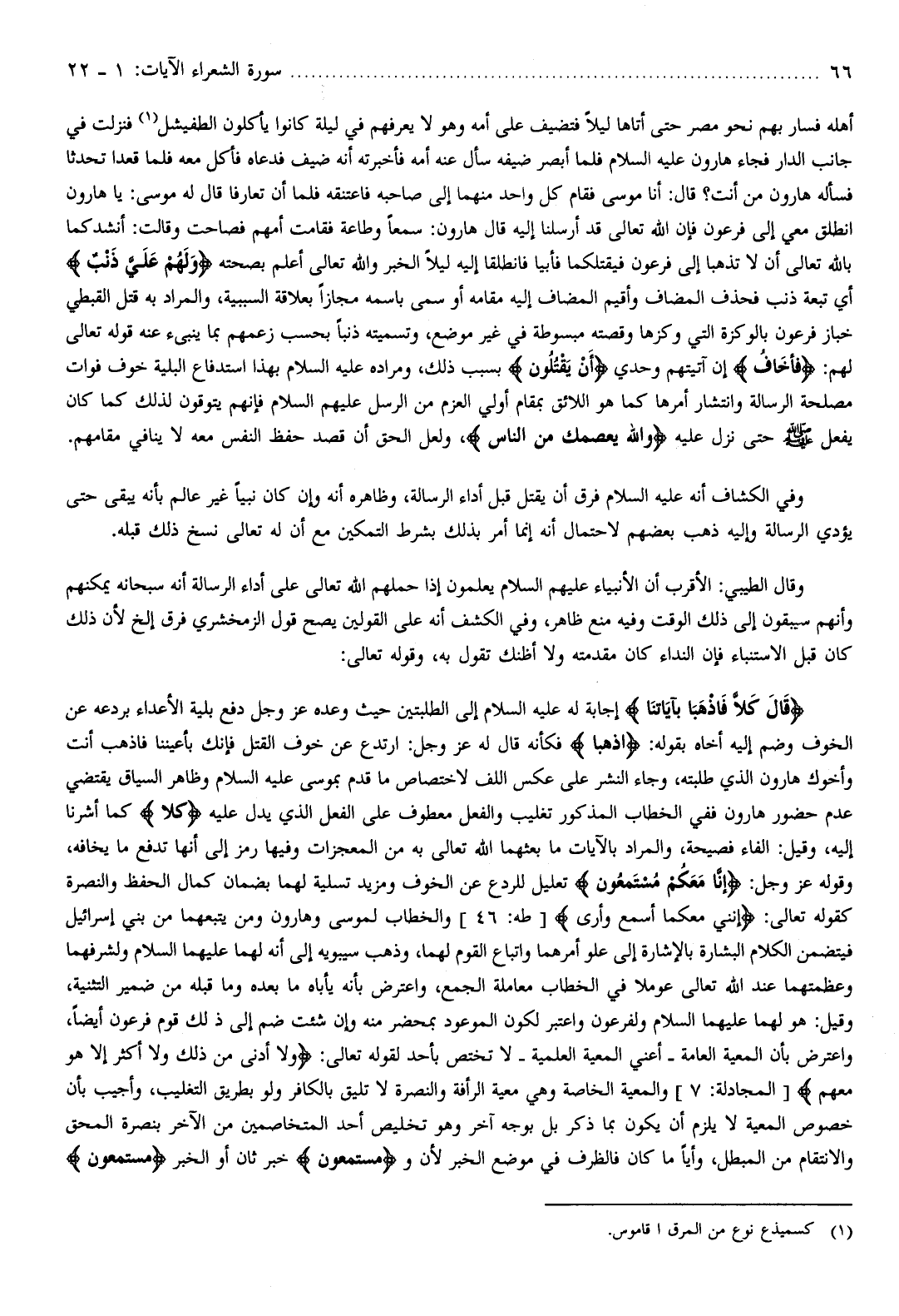 والله تعالى أعلم بصحته وَلَهُمْ عَلَيَّ ذَنْبٌ أي تبعة ذنب فحذف المضاف وأقيم المضاف إليه مقامه أو سمى باسمه مجازا بعلاقة السببية، والمراد به قتل القبطي خباز فرعون بالوكزة التي وكزها وقصته مبسوطة في غير موضع، وتسميته ذنبا بحسب زعمهم بما ينبىء عنه قوله تعالى لهم: فَأَخافُ إن آتيتهم وحدي أَنْ يَقْتُلُونِ بسبب ذلك، ومراده عليه السلام بهذا استدفاع البلية خوف فوات مصلحة الرسالة وانتشار أمرها كما هو اللائق بمقام أولي العزم من الرسل عليهم السلام فإنهم يتوقون لذلك كما كان يفعل صلّى الله عليه وسلّم حتى نزل عليه وَاللَّهُ يَعْصِمُكَ مِنَ النَّاسِ، ولعل الحق أن قصد حفظ النفس معه لا ينافي مقامهم.