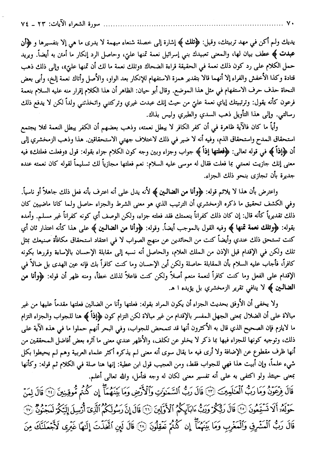 وفي الكشف تحقيق ما ذكره الزمخشري أن الترتيب الذي هو معنى الشرط والجزاء حاصل ولما كانا ماضيين كان ذلك تقديريا كأنه قال: إن كان ذلك كفرانا بنعمتك فقد فعلته جزاء، ولكن الوصف أي كونه كفرانا غير مسلم. وأمده بقوله: وَتِلْكَ نِعْمَةٌ تَمُنُّها وفيه القول بالموجب أيضا. وقوله: وَأَنَا مِنَ الضَّالِّينَ على هذا كأنه اعتذار ثان أي كنت تستحق ذلك عندي وأيضا كنت من الحائدين عن منهج الصواب لا في اعتقاد استحقاق مكافأة صنيعك بمثل تلك ولكن في الإقدام قبل الإذن من الملك العلام، والحاصل أنه نسبه إلى مقابلة الإحسان بالإساءة وقررها بكونه كافرا، فأجاب عليه السلام بأن المقابلة حاصلة ولكن أين الإحسان وما كنت كافرا بك فإنه عين الهدى بل ضالا في الإقدام على الفعل وما كنت كافرا لنعمة منعم أصلا ولكن كنت فاعلا لذلك خطأ، ومنه ظهر أن قوله: وَأَنَا مِنَ الضَّالِّينَ لا ينافي تقرير الزمخشري بل يؤيده اه.