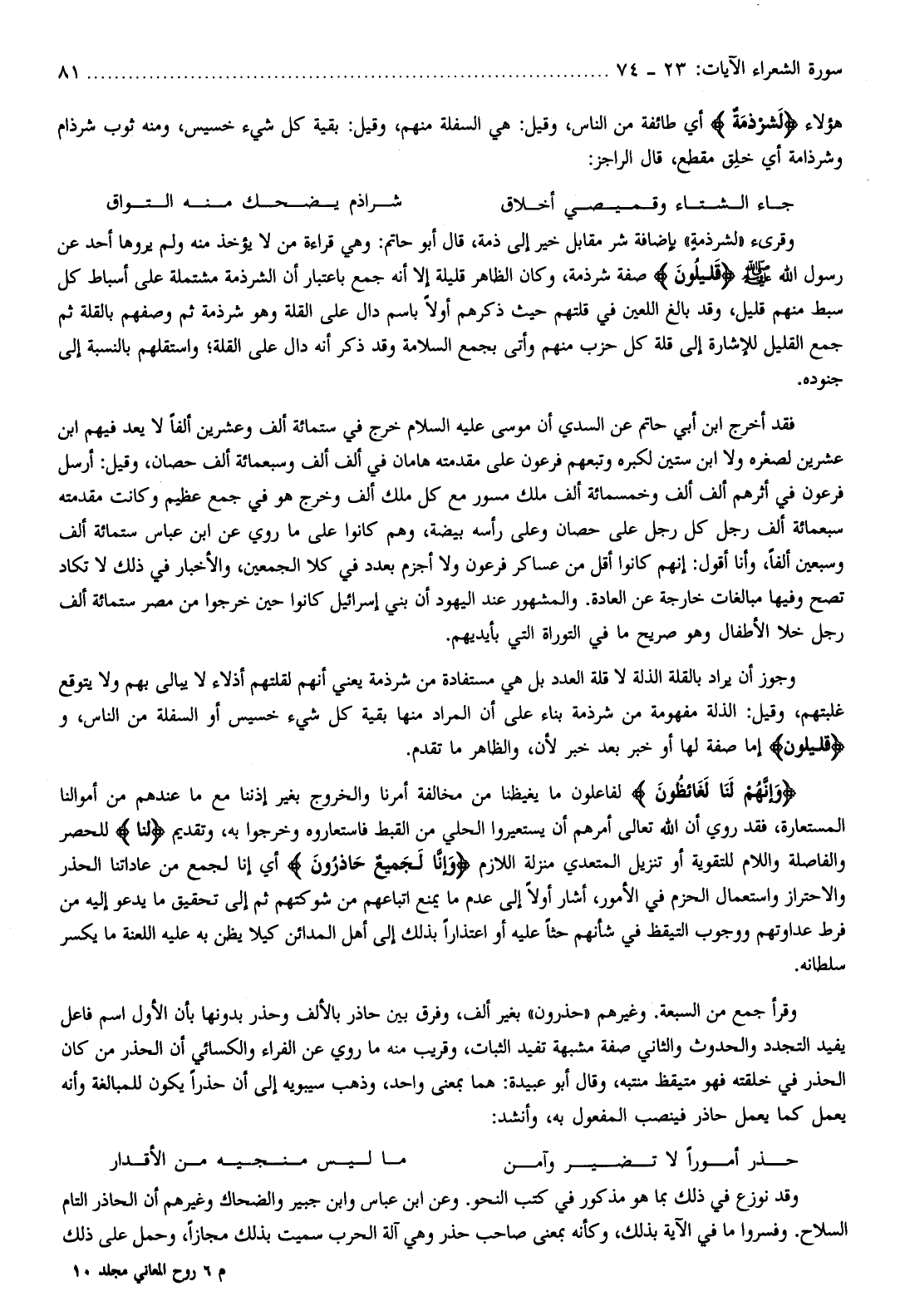 وجوز أن يراد بالقلة الذلة لا قلة العدد بل هي مستفادة من شرذمة يعني أنهم لقلتهم أذلاء لا يبالى بهم ولا يتوقع غلبتهم، وقيل: الذلة مفهومة من شرذمة بناء على أن المراد منها بقية كل شيء خسيس أو السفلة من الناس، وقَلِيلُونَ إما صفة لها أو خبر بعد خبر لأن، والظاهر ما تقدم.