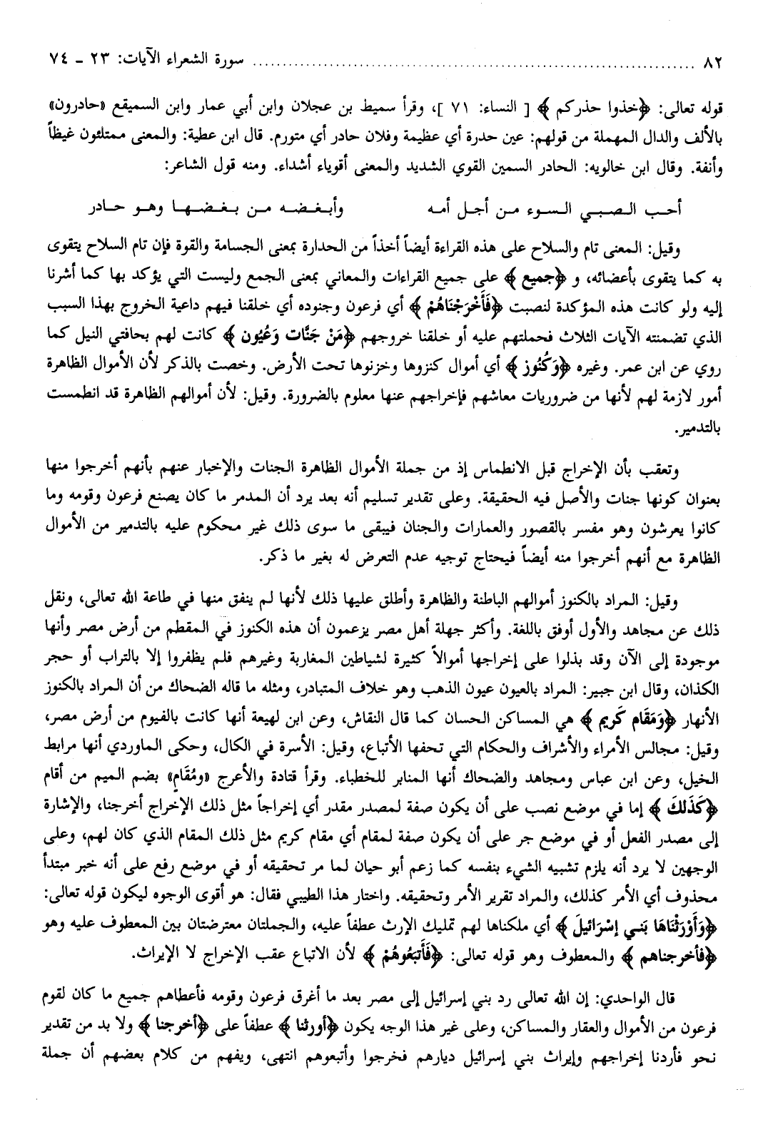 وقيل: المعنى تام والسلاح على هذه القراءة أيضا أخذا من الحدارة بمعنى الجسامة والقوة فإن تام السلاح يتقوى به كما يتقوى بأعضائه، و (جميع) على جميع القراءات والمعاني بمعنى الجمع وليست التي يؤكد بها كما أشرنا إليه ولو كانت هذه المؤكدة لنصبت فَأَخْرَجْناهُمْ أي فرعون وجنوده أي خلقنا فيهم داعية الخروج بهذا السبب الذي تضمنته الآيات الثلاث فحملتهم عليه أو خلقنا خروجهم مِنْ جَنَّاتٍ وَعُيُونٍ كانت لهم بحافتي النيل كما روي عن ابن عمر. وغيره وَكُنُوزٍ أي أموال كنزوها وخزنوها تحت الأرض. وخصت بالذكر لأن الأموال الظاهرة أمور لازمة لهم لأنها من ضروريات معاشهم فإخراجهم عنها معلوم بالضرورة. وقيل: لأن أموالهم الظاهرة قد انطمست بالتدمير.