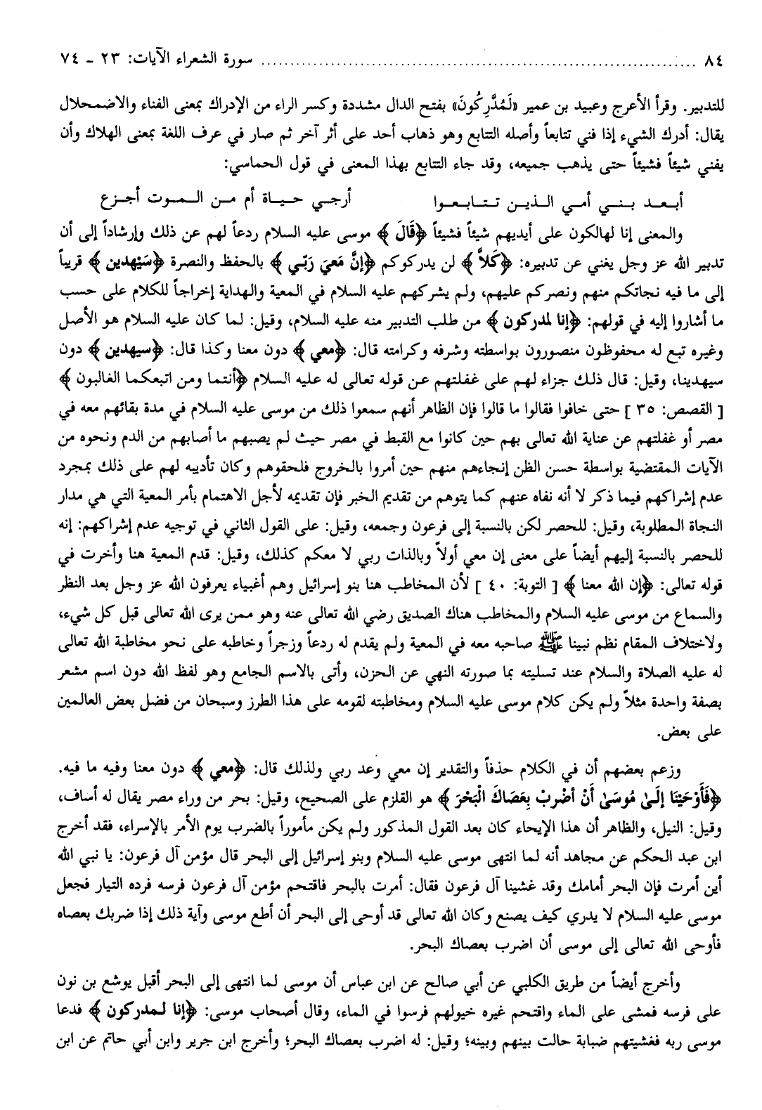 والمعنى إنا لهالكون على أيديهم شيئا فشيئا قالَ موسى عليه السلام ردعا لهم عن ذلك وإرشادا إلى أن تدبير الله عز وجل يغني عن تدبيره: كَلَّا لن يدركوكم إِنَّ مَعِي رَبِّي بالحفظ والنصرة سَيَهْدِينِ قريبا إلى ما فيه نجاتكم منهم ونصركم عليهم، ولم يشركهم عليه السلام في المعية والهداية إخراجا للكلام على حسب ما أشاروا إليه في قولهم: إِنَّا لَمُدْرَكُونَ من طلب التدبير منه عليه السلام، وقيل: لما كان عليه السلام هو الأصل وغيره تبع له محفوظون منصورون بواسطته وشرفه وكرامته قال: مَعِي دون معنا وكذا قال: سَيَهْدِينِ دون سيهدينا، وقيل: قال ذلك جزاء لهم على غفلتهم عن قوله تعالى له عليه السلام أَنْتُما وَمَنِ اتَّبَعَكُمَا الْغالِبُونَ [القصص: 35] حتى خافوا فقالوا ما قالوا فإن الظاهر أنهم سمعوا ذلك من موسى عليه السلام في مدة بقائهم معه في مصر أو غفلتهم عن عناية الله تعالى بهم حين كانوا مع القبط في مصر حيث لم يصبهم ما أصابهم من الدم ونحوه من الآيات المقتضية بواسطة حسن الظن إنجاءهم منهم حين أمروا بالخروج فلحقوهم وكان تأديبه لهم على ذلك بمجرد عدم إشراكهم فيما ذكر لا أنه نفاه عنهم كما يتوهم من تقديم الخبر فإن تقديمه لأجل الاهتمام بأمر المعية التي هي مدار النجاة المطلوبة، وقيل: للحصر لكن بالنسبة إلى فرعون وجمعه، وقيل: على القول الثاني في توجيه عدم إشراكهم: إنه للحصر بالنسبة إليهم أيضا على معنى إن معي أولا وبالذات ربي لا معكم كذلك، وقيل: قدم المعية هنا وأخرت في قوله تعالى: إِنَّ اللَّهَ مَعَنا [التوبة: 40] لأن المخاطب هنا بنو إسرائيل وهم أغبياء يعرفون الله عز وجل بعد النظر والسماع من موسى عليه السلام والمخاطب هناك الصديق رضي الله تعالى عنه وهو ممن يرى الله تعالى قبل كل شيء، ولاختلاف المقام نظم نبينا صلّى الله عليه وسلّم صاحبه معه في المعية ولم يقدم له ردعا وزجرا وخاطبه على نحو مخاطبة الله تعالى له عليه الصلاة والسلام عند تسليته بما صورته النهي عن الحزن، وأتى بالاسم الجامع وهو لفظ الله دون اسم مشعر بصفة واحدة مثلا ولم يكن كلام موسى عليه السلام ومخاطبته لقومه على هذا الطرز وسبحان من فضل بعض العالمين على بعض.
