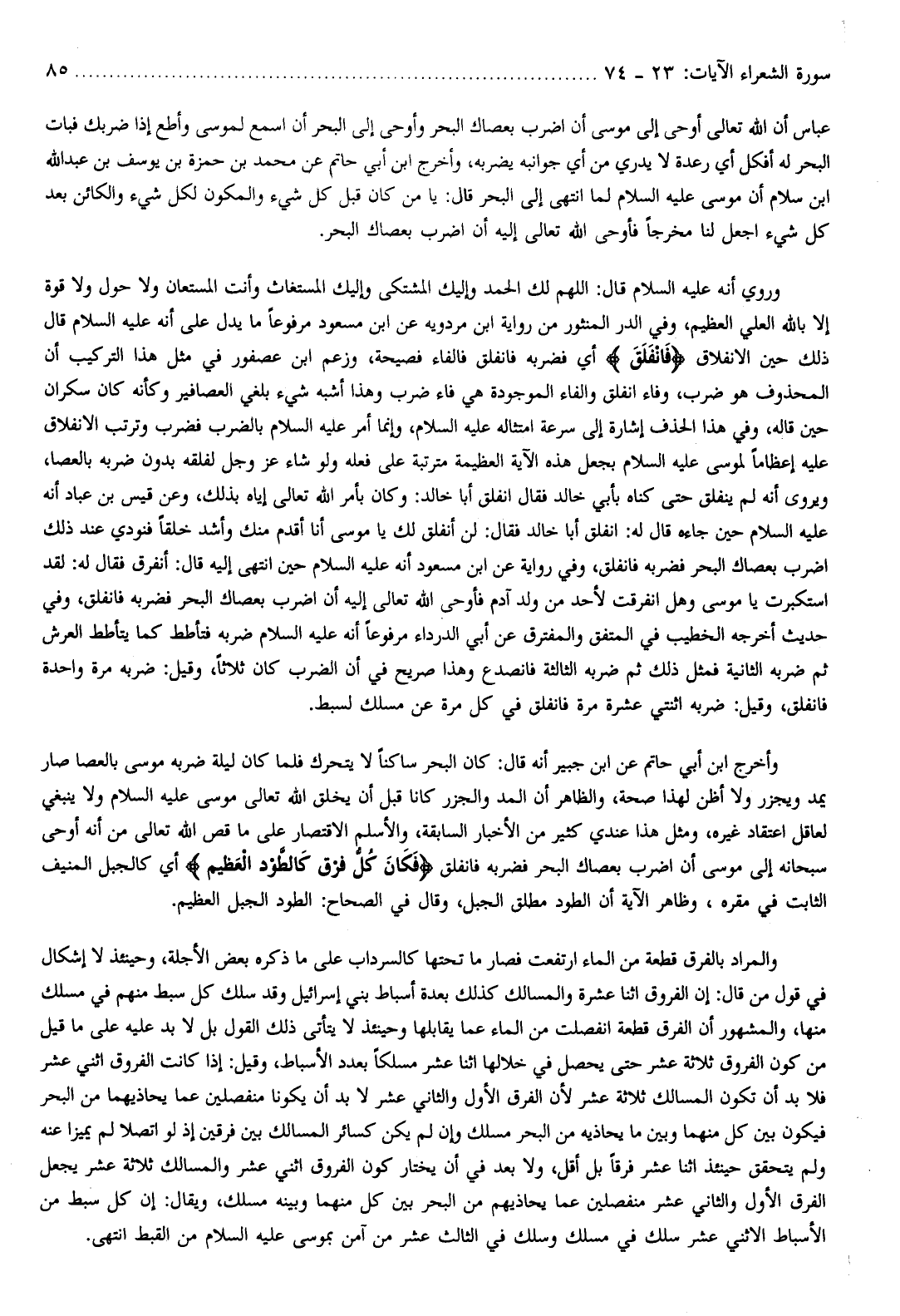 وهذا صريح في أن الضرب كان ثلاثا، وقيل: ضربه مرة واحدة فانفلق، وقيل: ضربه اثنتي عشرة مرة فانفلق في كل مرة عن مسلك لسبط.