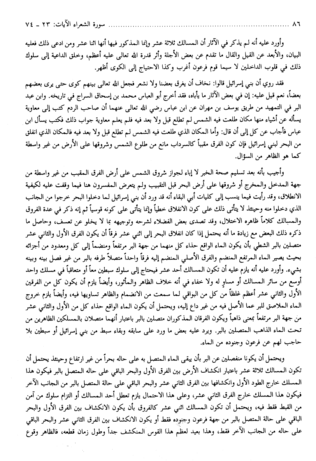 ويحتمل أن يكونا منفصلين عن البر بأن يبقى الماء المتصل به على حاله بحرا من غير ارتفاع وحينئذ يحتمل أن تكون المسالك ثلاثة عشر باعتبار انكشاف الأرض بين الفرق الأول والبحر الباقي على حاله المتصل بالبر فيكون هذا المسلك خارج الطود الأول وانكشافها بين الفرق الثاني عشر والبحر الباقي على حالة المتصل بالبر من الجانب الآخر فيكون هذا المسلك خارج الفرق الثاني عشر، وعلى هذا الاحتمال يلزم تعطل أحد المسالك أو التزام سلوك من آمن من القبط فقط فيه، ويحتمل أن تكون المسالك اثني عشر كالفروق بأن يكون الانكشاف بين الفرق الأول والبحر الباقي على حالة المتصل بالبر من جهة فرعون وجنوده فقط أو يكون الانكشاف بين الفرق الثاني عشر والبحر الباقي على حاله من الجانب الآخر فقط، وهذا بعيد لعظم هذا القوس المنكشف جدا وطول زمان قطعه، فالظاهر وقوع