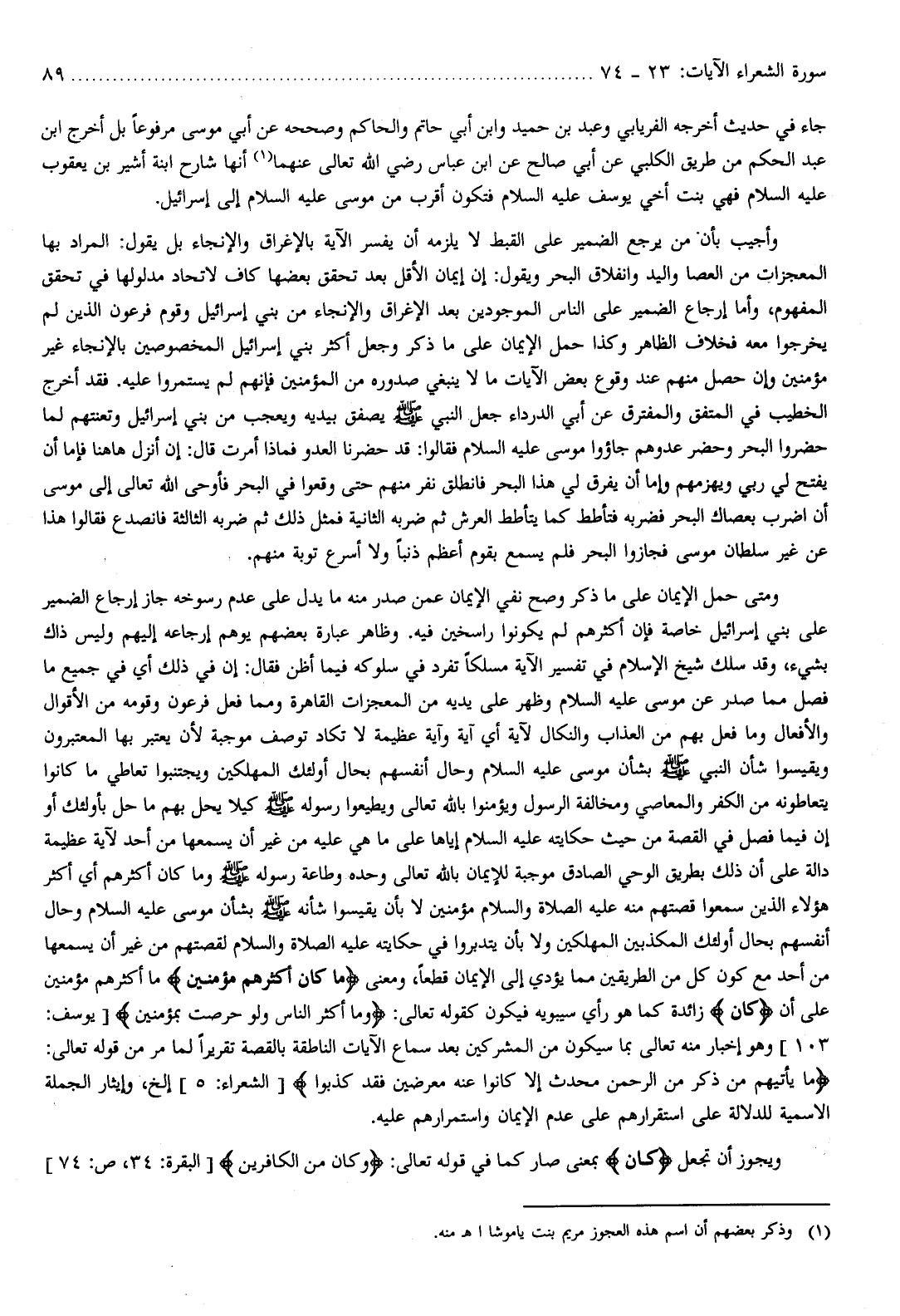 ومتى حمل الإيمان على ما ذكر وصح نفي الإيمان عمن صدر منه ما يدل على عدم رسوخه جاز إرجاع الضمير على بني إسرائيل خاصة فإن أكثرهم لم يكونوا راسخين فيه. وظاهر عبارة بعضهم يوهم إرجاعه إليهم وليس ذاك بشيء، وقد سلك شيخ الإسلام في تفسير الآية مسلكا تفرد في سلوكه فيما أظن فقال: إن في ذلك أي في جميع ما فصل مما صدر عن موسى عليه السلام وظهر على يديه من المعجزات القاهرة ومما فعل فرعون وقومه من الأقوال والأفعال وما فعل بهم من العذاب والنكال لآية أي آية وآية عظيمة لا تكاد توصف موجبة لأن يعتبر بها المعتبرون ويقيسوا شأن النبي صلّى الله عليه وسلّم بشأن موسى عليه السلام وحال أنفسهم بحال أولئك المهلكين ويجتنبوا تعاطي ما كانوا يتعاطونه من الكفر والمعاصي ومخالفة الرسول ويؤمنوا بالله تعالى ويطيعوا رسوله صلّى الله عليه وسلّم كيلا يحل بهم ما حل بأولئك أو إن فيما فصل في القصة من حيث حكايته عليه السلام إياها على ما هي عليه من غير أن يسمعها من أحد لآية عظيمة دالة على أن ذلك بطريق الوحي الصادق موجبة للإيمان بالله تعالى وحده وطاعة رسوله صلّى الله عليه وسلّم وما كان أكثرهم أي أكثر هؤلاء الذين سمعوا قصتهم منه عليه الصلاة والسلام مؤمنين لا بأن يقيسوا شأنه صلّى الله عليه وسلّم بشأن موسى عليه السلام وحال أنفسهم بحال أولئك المكذبين المهلكين ولا بأن يتدبروا في حكايته عليه الصلاة والسلام لقصتهم من غير أن يسمعها من أحد مع كون كل من الطريقين مما يؤدي إلى الإيمان قطعا، ومعنى ما كانَ أَكْثَرُهُمْ مُؤْمِنِينَ ما أكثرهم مؤمنين على أن كانَ زائدة كما هو رأي سيبويه فيكون كقوله تعالى: وَما أَكْثَرُ النَّاسِ وَلَوْ حَرَصْتَ بِمُؤْمِنِينَ [يوسف:
