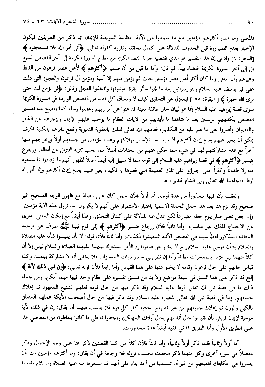 فالمعنى وما صار أكثرهم مؤمنين مع ما سمعوا من الآية العظيمة الموجبة للإيمان بما ذكر من الطريقين فيكون الإخبار بعدم الصيرورة قبل الحدوث للدلالة على كمال تحققه وتقرره كقوله تعالى: أَتى أَمْرُ اللَّهِ فَلا تَسْتَعْجِلُوهُ [النحل: 1] وادعى إن هذا التفسير هو الذي تقتضيه جزالة النظم الكريم من مطلع السورة الكريمة إلى آخر القصص السبع بل إلى آخر السورة الكريمة اقتضاء بينا. ثم قال: وأما ما قيل من أن ضمير أَكْثَرُهُمْ لأهل عصر فرعون من القبط وغيرهم وأن المعنى وما كان أكثر أهل مصر مؤمنين حيث لم يؤمن منهم إلا آسية ومؤمن آل فرعون والعجوز التي دلت على قبر يوسف عليه السلام وبنو إسرائيل بعد ما نجوا سألوا بقرة يعبدونها واتخذوا العجل وقالوا: لَنْ نُؤْمِنَ لَكَ حَتَّى نَرَى اللَّهَ جَهْرَةً [البقرة: 55] فبمعزل عن التحقيق كيف لا ومساق كل قصة من القصص الواردة في السورة الكريمة سوى قصة إبراهيم عليه السلام إنما هو لبيان حال طائفة معينة قد عتوا عن أمر ربهم وعصوا رسله كما يفصح عنه تصدير القصص بتكذيبهم المرسلين بعد ما شاهدا ما بأيديهم من الآيات العظام ما يوجب عليهم الإيمان ويزجرهم عن الكفر والعصيان وأصروا على ما هم عليه من التكذيب فعاقبهم الله تعالى لذلك بالعقوبة الدنيوية وقطع دابرهم بالكلية فكيف يمكن أن يخبر عنهم بعدم إيمان أكثرهم لا سيما بعد الإخبار بهلاكهم وعد المؤمنين من جملتهم أولا وإخراجهم منها آخرا مع عدم مشاركتهم لهم في شيء مما حكى عنهم من الجنايات أصلا مما يجب تنزيه التنزيل عن أمثاله. ورجوع ضمير أَكْثَرُهُمْ في قصة إبراهيم عليه السلام إلى قومه مما لا سبيل إليه أيضا أصلا لظهور أنهم ما ازدادوا بما سمعوه منه إلا طغيانا وكفرا حتى اجترءوا على تلك العظيمة التي فعلوها به فكيف يعبر عنهم بعدم إيمان أكثرهم وإنما آمن له لوط فنجاهما الله تعالى إلى الشام فتدبر اه.