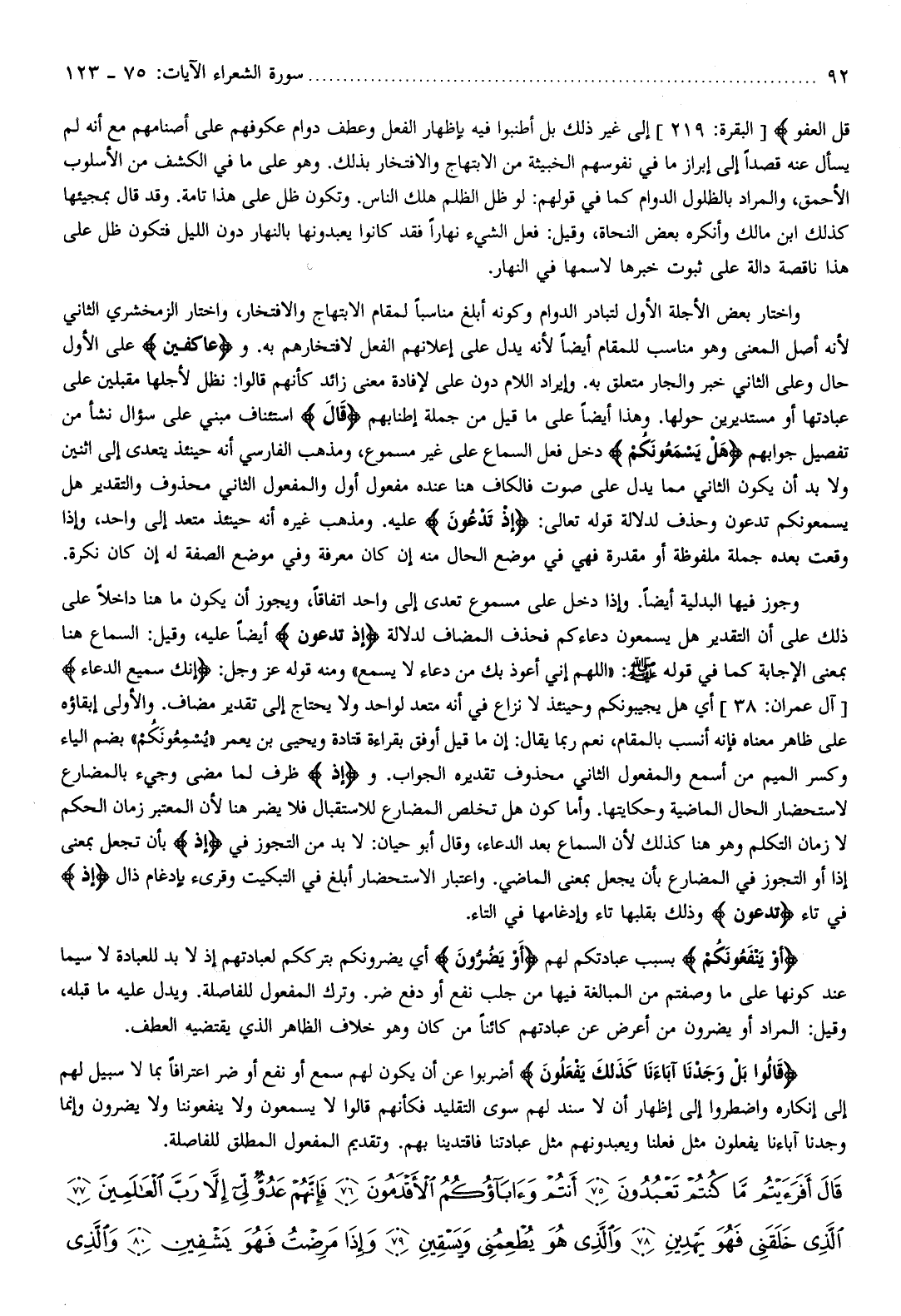واختار بعض الأجلة الأول لتبادر الدوام وكونه أبلغ مناسبا لمقام الابتهاج والافتخار، واختار الزمخشري الثاني لأنه أصل المعنى وهو مناسب للمقام أيضا لأنه يدل على إعلانهم الفعل لافتخارهم به. وعاكِفِينَ على الأول حال وعلى الثاني خبر والجار متعلق به. وإيراد اللام دون على لإفادة معنى زائد كأنهم قالوا: نظل لأجلها مقبلين على عبادتها أو مستديرين حولها. وهذا أيضا على ما قيل من جملة إطنابهم قالَ استئناف مبني على سؤال نشأ من تفصيل جوابهم هَلْ يَسْمَعُونَكُمْ دخل فعل السماع على غير مسموع، ومذهب الفارسي أنه حينئذ يتعدى إلى اثنين ولا بد أن يكون الثاني مما يدل على صوت فالكاف هنا عنده مفعول أول والمفعول الثاني محذوف والتقدير هل يسمعونكم تدعون وحذف لدلالة قوله تعالى: إِذْ تَدْعُونَ عليه. ومذهب غيره أنه حينئذ متعد إلى واحد، وإذا وقعت بعده جملة ملفوظة أو مقدرة فهي في موضع الحال منه إن كان معرفة وفي موضع الصفة له إن كان نكرة.