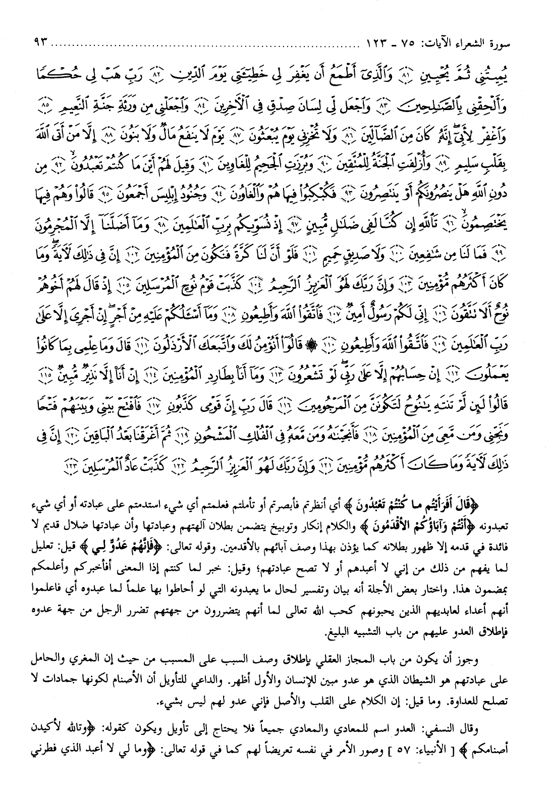 قالَ أَفَرَأَيْتُمْ ما كُنْتُمْ تَعْبُدُونَ أي أنظرتم فأبصرتم أو تأملتم فعلمتم أي شيء استدمتم على عبادته أو أي شيء تعبدونه أَنْتُمْ وَآباؤُكُمُ الْأَقْدَمُونَ والكلام إنكار وتوبيخ يتضمن بطلان آلهتهم وعبادتها وأن عبادتها ضلال قديم لا فائدة في قدمه إلا ظهور بطلانه كما يؤذن بهذا وصف آبائهم بالأقدمين. وقوله تعالى: فَإِنَّهُمْ عَدُوٌّ لِي قيل: تعليل لما يفهم من ذلك من إني لا أعبدهم أو لا تصح عبادتهم وقيل: خبر لما كنتم إذا المعنى أفأخبركم وأعلمكم بمضمون هذا. واختار بعض الأجلة أنه بيان وتفسير لحال ما يعبدونه التي لو أحاطوا بها علما لما عبدوه أي فاعلموا أنهم أعداء لعابديهم الذين يحبونهم كحب الله تعالى لما أنهم يتضررون من جهتهم تضرر الرجل من جهة عدوه فإطلاق العدو عليهم من باب التشبيه البليغ.