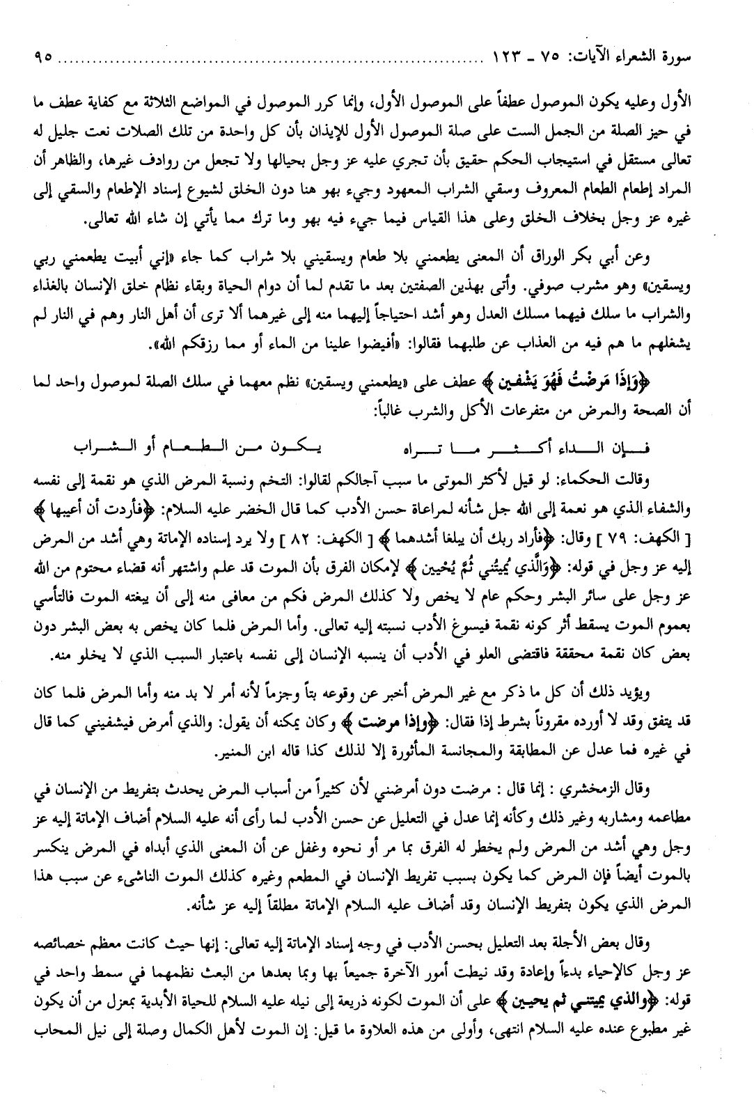 ويؤيد ذلك أن كل ما ذكر مع غير المرض أخبر عن وقوعه بتا وجزما لأنه أمر لا بد منه وأما المرض فلما كان قد يتفق وقد لا أورده مقرونا بشرط إذا فقال: وَإِذا مَرِضْتُ وكان يمكنه أن يقول: والذي أمرض فيشفيني كما قال في غيره فما عدل عن المطابقة والمجانسة المأثورة إلا لذلك كذا قاله ابن المنير.