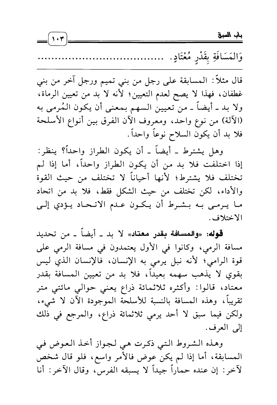قوله: «والمسافة بقدر معتاد» لا بد ـ أيضاً ـ من تحديد مسافة الرمي، وكانوا في الأول يعتمدون في مسافة الرمي على قوة الرامي؛ لأنه نبل يرمي به الإنسان، فالإنسان الذي ليس بقوي لا يذهب سهمه بعيداً، فلا بد من تعيين المسافة بقدر معتاد، قالوا: وأكثره ثلاثمائة ذراع يعني حوالي مائتي متر تقريباً، وهذه المسافة بالنسبة للأسلحة الموجودة الآن لا شيء، ولكن فيما سبق لا أحد يرمي ثلاثمائة ذراع، والمرجع في ذلك إلى العرف.