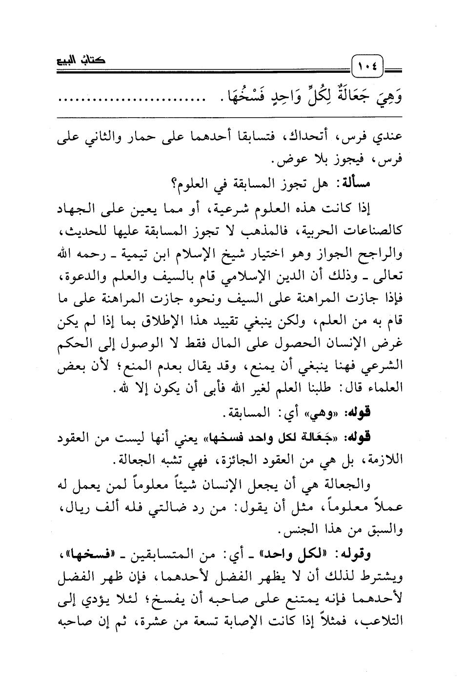 وقوله: «لكل واحد» ـ أي: من المتسابقين ـ «فسخها»، ويشترط لذلك أن لا يظهر الفضل لأحدهما، فإن ظهر الفضل لأحدهما فإنه يمتنع على صاحبه أن يفسخ؛ لئلا يؤدي إلى التلاعب، فمثلاً إذا كانت الإصابة تسعة من عشرة، ثم إن صاحبه