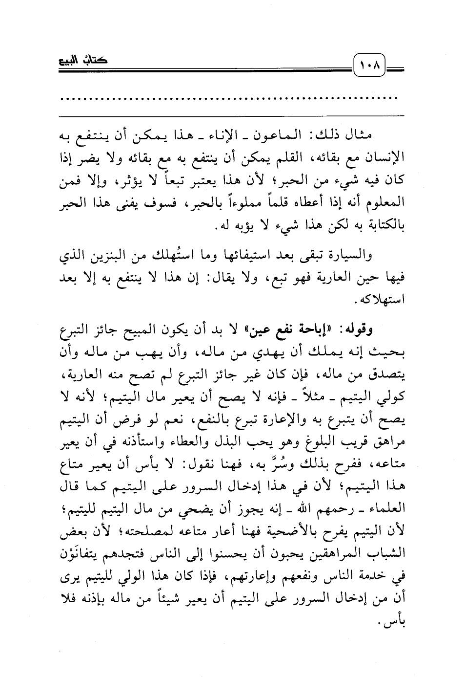 مثال ذلك: الماعون ـ الإناء ـ هذا يمكن أن ينتفع به الإنسان مع بقائه، القلم يمكن أن ينتفع به مع بقائه ولا يضر إذا كان فيه شيء من الحبر؛ لأن هذا يعتبر تبعاً لا يؤثر، وإلا فمن المعلوم أنه إذا أعطاه قلماً مملوءاً بالحبر، فسوف يفنى هذا الحبر بالكتابة به لكن هذا شيء لا يؤبه له.