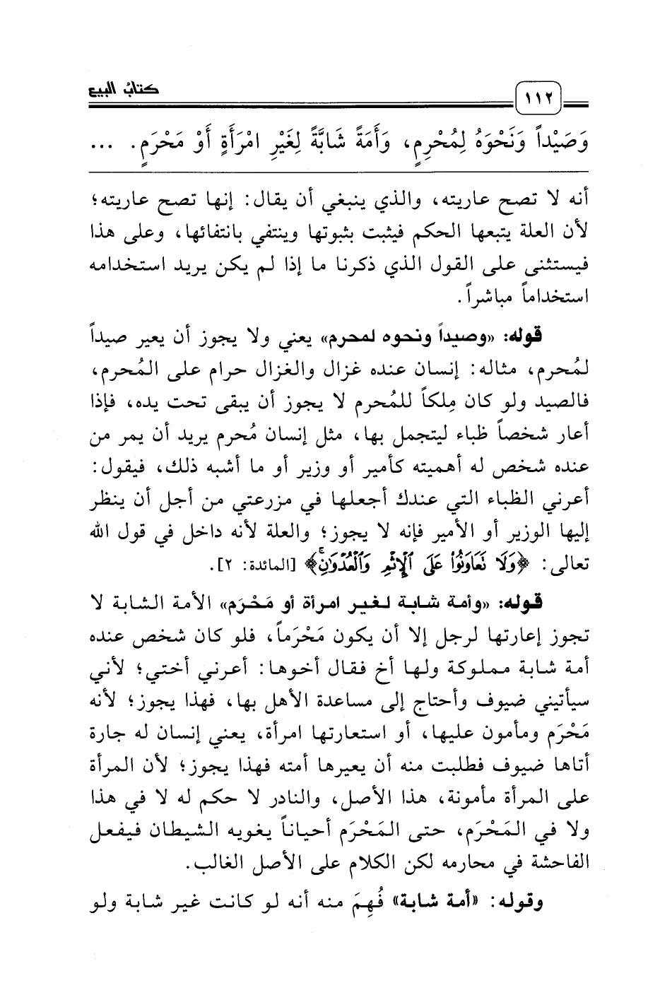 قوله: «وأمة شابة لغير امرأة أو مَحْرَم» الأمة الشابة لا تجوز إعارتها لرجل إلا أن يكون مَحْرَماً، فلو كان شخص عنده أمة شابة مملوكة ولها أخ فقال أخوها: أعرني أختي؛ لأني سيأتيني ضيوف وأحتاج إلى مساعدة الأهل بها، فهذا يجوز؛ لأنه مَحْرَم ومأمون عليها، أو استعارتها امرأة، يعني إنسان له جارة أتاها ضيوف فطلبت منه أن يعيرها أمته فهذا يجوز؛ لأن المرأة على المرأة مأمونة، هذا الأصل، والنادر لا حكم له لا في هذا ولا في المَحْرَم، حتى المَحْرَم أحياناً يغويه الشيطان فيفعل الفاحشة في محارمه لكن الكلام على الأصل الغالب.