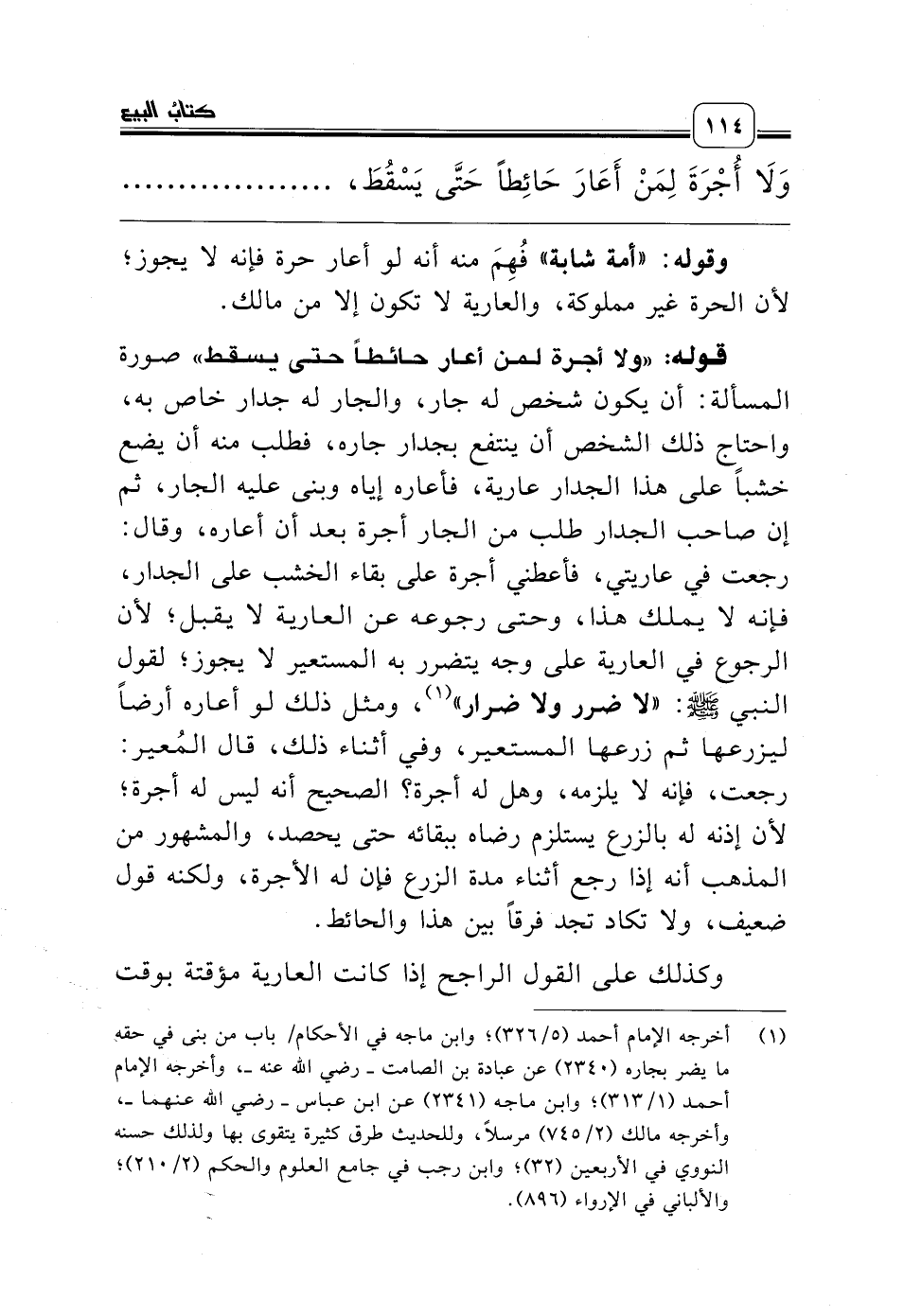 قوله: «ولا أجرة لمن أعار حائطاً حتى يسقط» صورة المسألة: أن يكون شخص له جار، والجار له جدار خاص به، واحتاج ذلك الشخص أن ينتفع بجدار جاره، فطلب منه أن يضع خشباً على هذا الجدار عارية، فأعاره إياه وبنى عليه الجار، ثم إن صاحب الجدار طلب من الجار أجرة بعد أن أعاره، وقال: رجعت في عاريتي، فأعطني أجرة على بقاء الخشب على الجدار، فإنه لا يملك هذا، وحتى رجوعه عن العارية لا يقبل؛ لأن الرجوع في العارية على وجه يتضرر به المستعير لا يجوز؛ لقول النبي صلّى الله عليه وسلّم: «لا ضرر ولا ضرار» (¬1)، ومثل ذلك لو أعاره أرضاً ليزرعها ثم زرعها المستعير، وفي أثناء ذلك، قال المُعير: رجعت، فإنه لا يلزمه، وهل له أجرة؟ الصحيح أنه ليس له أجرة؛ لأن إذنه له بالزرع يستلزم رضاه ببقائه حتى يحصد، والمشهور من المذهب أنه إذا رجع أثناء مدة الزرع فإن له الأجرة، ولكنه قول ضعيف، ولا تكاد تجد فرقاً بين هذا والحائط.
