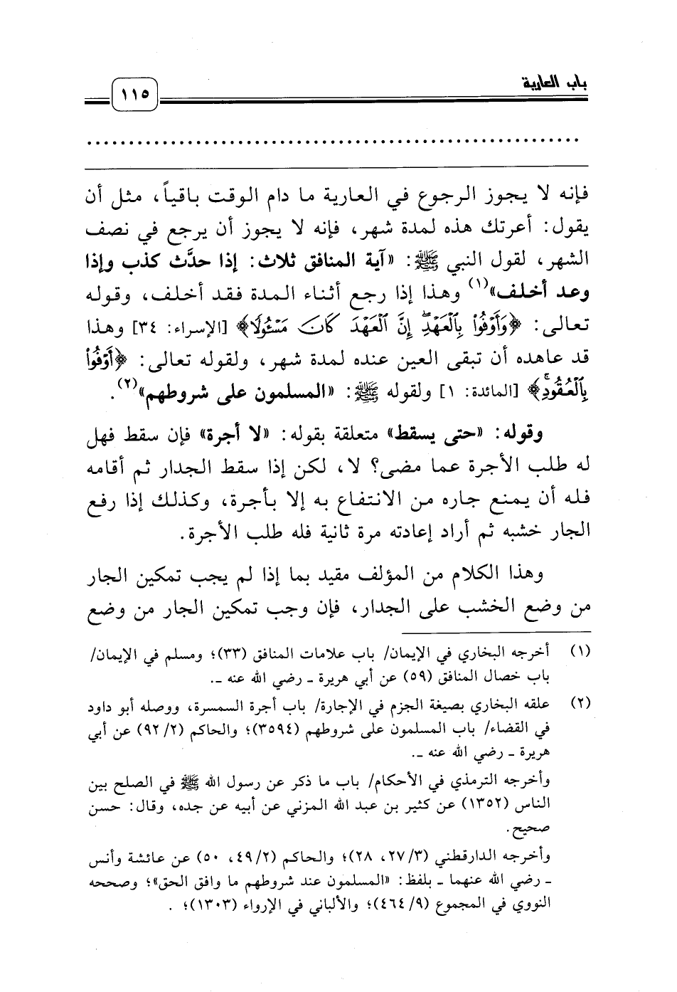 فإنه لا يجوز الرجوع في العارية ما دام الوقت باقياً، مثل أن يقول: أعرتك هذه لمدة شهر، فإنه لا يجوز أن يرجع في نصف الشهر، لقول النبي صلّى الله عليه وسلّم: «آية المنافق ثلاث: إذا حدَّث كذب وإذا وعد أخلف» (¬1) وهذا إذا رجع أثناء المدة فقد أخلف، وقوله تعالى: {وَأَوْفُوا بِالْعَهْدِ إِنَّ الْعَهْدَ كَانَ مَسْؤُولاً} [الإسراء: 34] وهذا قد عاهده أن تبقى العين عنده لمدة شهر، ولقوله تعالى: {أَوْفُوا بِالْعُقُودِ} [المائدة: 1] ولقوله صلّى الله عليه وسلّم: «المسلمون على شروطهم» (¬2).