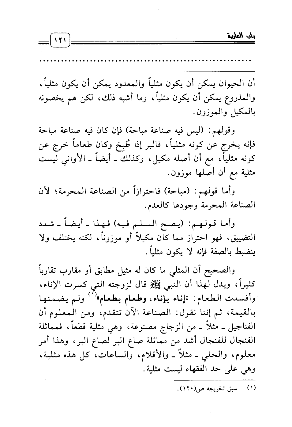وقولهم: (ليس فيه صناعة مباحة) فإن كان فيه صناعة مباحة فإنه يخرج عن كونه مثلياً، فالبر إذا طُبِخ وكان طعاماً خرج عن كونه مثلياً، مع أن أصله مكيل، وكذلك ـ أيضاً ـ الأواني ليست مثلية مع أن أصلها موزون.