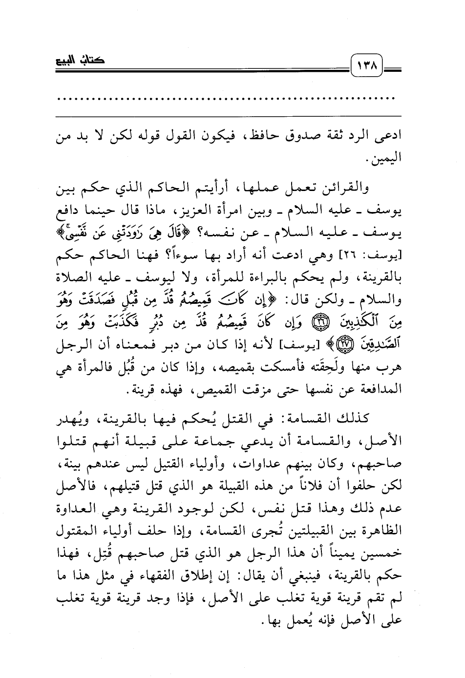 والقرائن تعمل عملها، أرأيتم الحاكم الذي حكم بين يوسف ـ عليه السلام ـ وبين امرأة العزيز، ماذا قال حينما دافع يوسف ـ عليه السلام ـ عن نفسه؟ {قَالَ هِيَ رَاوَدَتْنِي عَنْ نَفْسِي} [يوسف: 26] وهي ادعت أنه أراد بها سوءاً؟ فهنا الحاكم حكم بالقرينة، ولم يحكم بالبراءة للمرأة، ولا ليوسف ـ عليه الصلاة والسلام ـ ولكن قال: {إِنْ كَانَ قَمِيصُهُ قُدَّ مِنْ قُبُلٍ فَصَدَقَتْ وَهُوَ مِنَ الْكَاذِبِينَ} {وَإِنْ كَانَ قَمِيصُهُ قُدَّ مِنْ دُبُرٍ فَكَذَبَتْ وَهُوَ مِنَ الصَّادِقِينَ *} [يوسف] لأنه إذا كان من دبر فمعناه أن الرجل هرب منها ولَحِقَته فأمسكت بقميصه، وإذا كان من قُبُل فالمرأة هي المدافعة عن نفسها حتى مزقت القميص، فهذه قرينة.