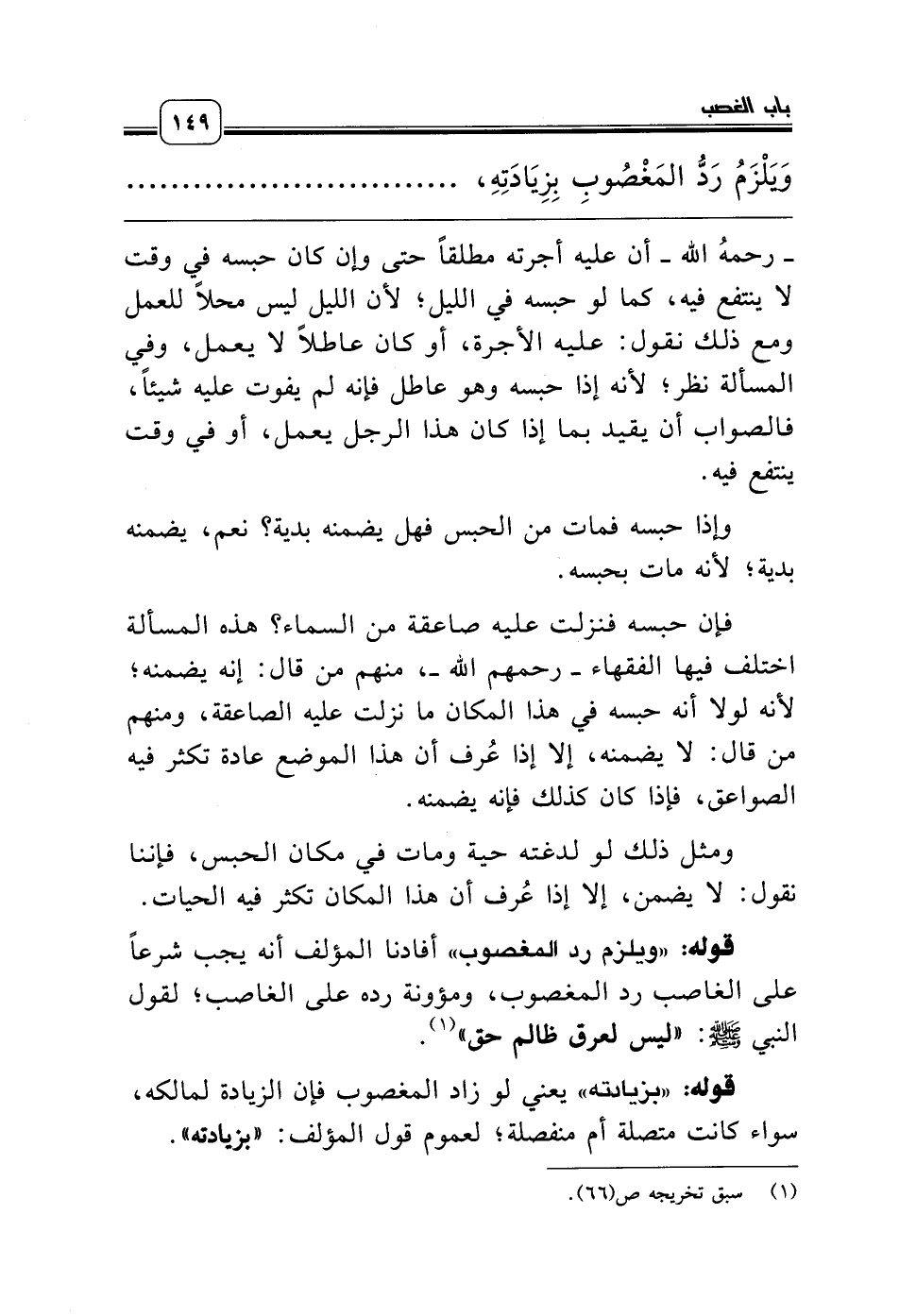ـ رحمه الله ـ أن عليه أجرته مطلقاً حتى وإن كان حبسه في وقت لا ينتفع فيه، كما لو حبسه في الليل؛ لأن الليل ليس محلاً للعمل ومع ذلك نقول: عليه الأجرة، أو كان عاطلاً لا يعمل، وفي المسألة نظر؛ لأنه إذا حبسه وهو عاطل فإنه لم يفوت عليه شيئاً، فالصواب أن يقيد بما إذا كان هذا الرجل يعمل، أو في وقت ينتفع فيه.