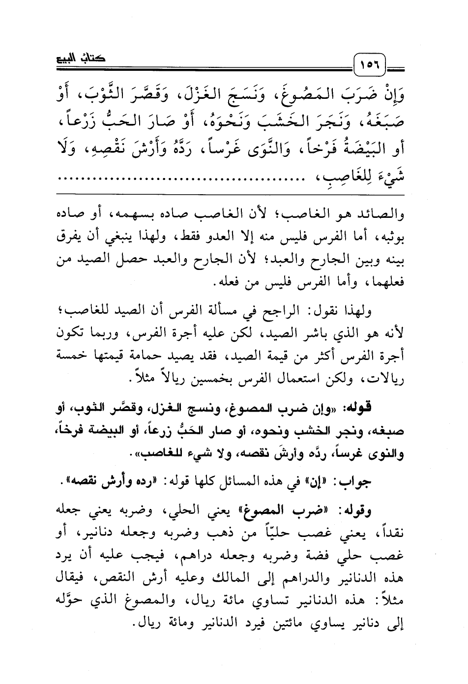 وَإِنْ ضَرَبَ المَصُوغَ، وَنَسَجَ الغَزْلَ، وَقَصَّرَ الثَّوْبَ، أَوْ صَبَغَهُ، وَنَجَرَ الخَشَبَ وَنَحْوَهُ، أَوْ صَارَ الحَبُّ زَرْعاً، أو البَيْضَةُ فَرْخاً، وَالنَّوَى غَرْساً، رَدَّهُ وَأَرْشَ نَقْصِهِ، وَلاَ شَيْءَ لِلغَاصِبِ، وَيَلْزَمُهُ ضَمَانُ نَقْصِهِ.