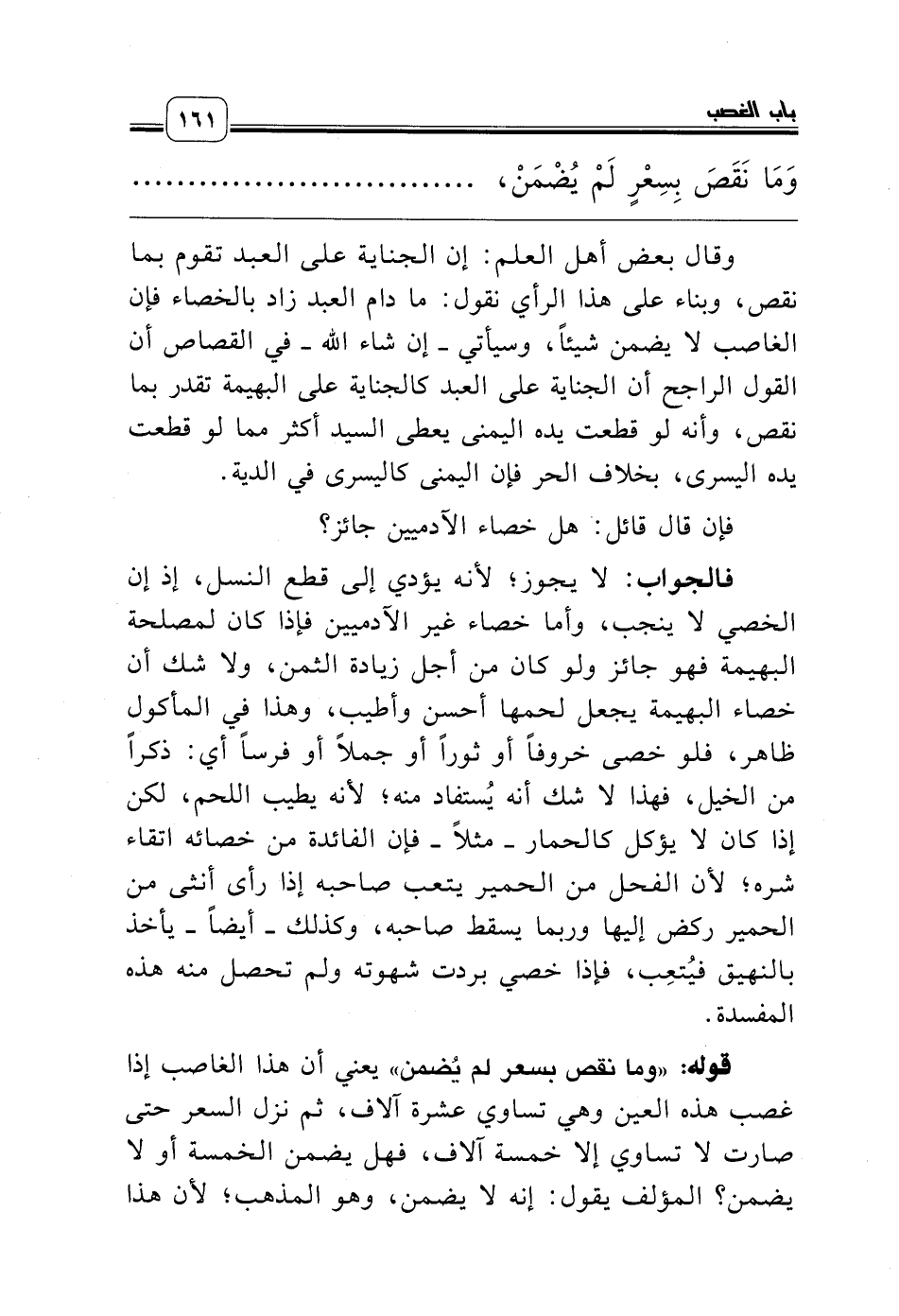 وقال بعض أهل العلم: إن الجناية على العبد تقوم بما نقص، وبناء على هذا الرأي نقول: ما دام العبد زاد بالخصاء فإن الغاصب لا يضمن شيئاً، وسيأتي ـ إن شاء الله ـ في القصاص أن القول الراجح أن الجناية على العبد كالجناية على البهيمة تقدر بما نقص، وأنه لو قطعت يده اليمنى يعطى السيد أكثر مما لو قطعت يده اليسرى، بخلاف الحر فإن اليمنى كاليسرى في الدية.
