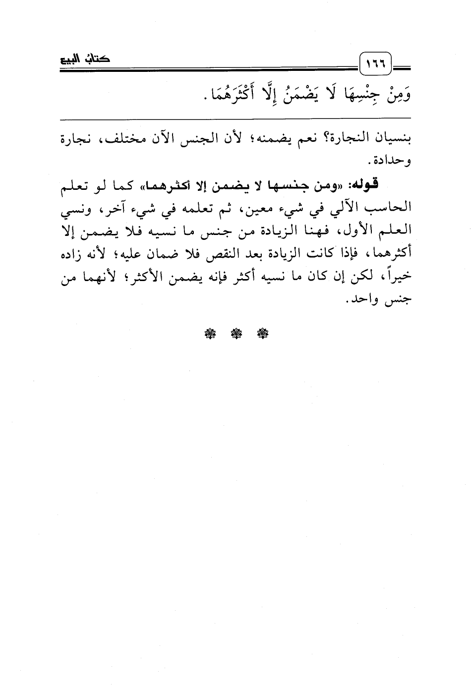 قوله: «ومن جنسها لا يضمن إلا أكثرهما» كما لو تعلم الحاسب الآلي في شيء معين، ثم تعلمه في شيء آخر، ونسي العلم الأول، فهنا الزيادة من جنس ما نسيه فلا يضمن إلا أكثرهما، فإذا كانت الزيادة بعد النقص فلا ضمان عليه؛ لأنه زاده خيراً، لكن إن كان ما نسيه أكثر فإنه يضمن الأكثر؛ لأنهما من جنس واحد.